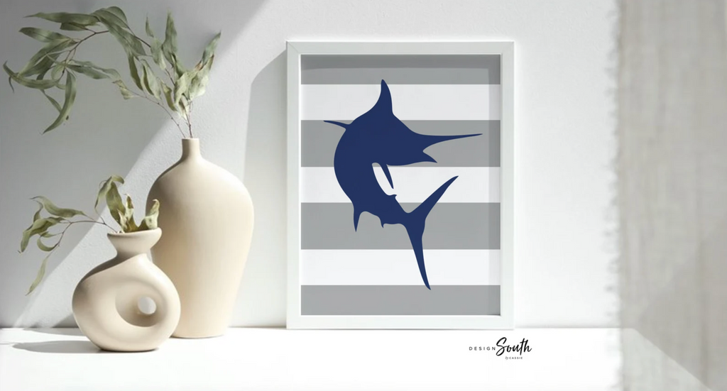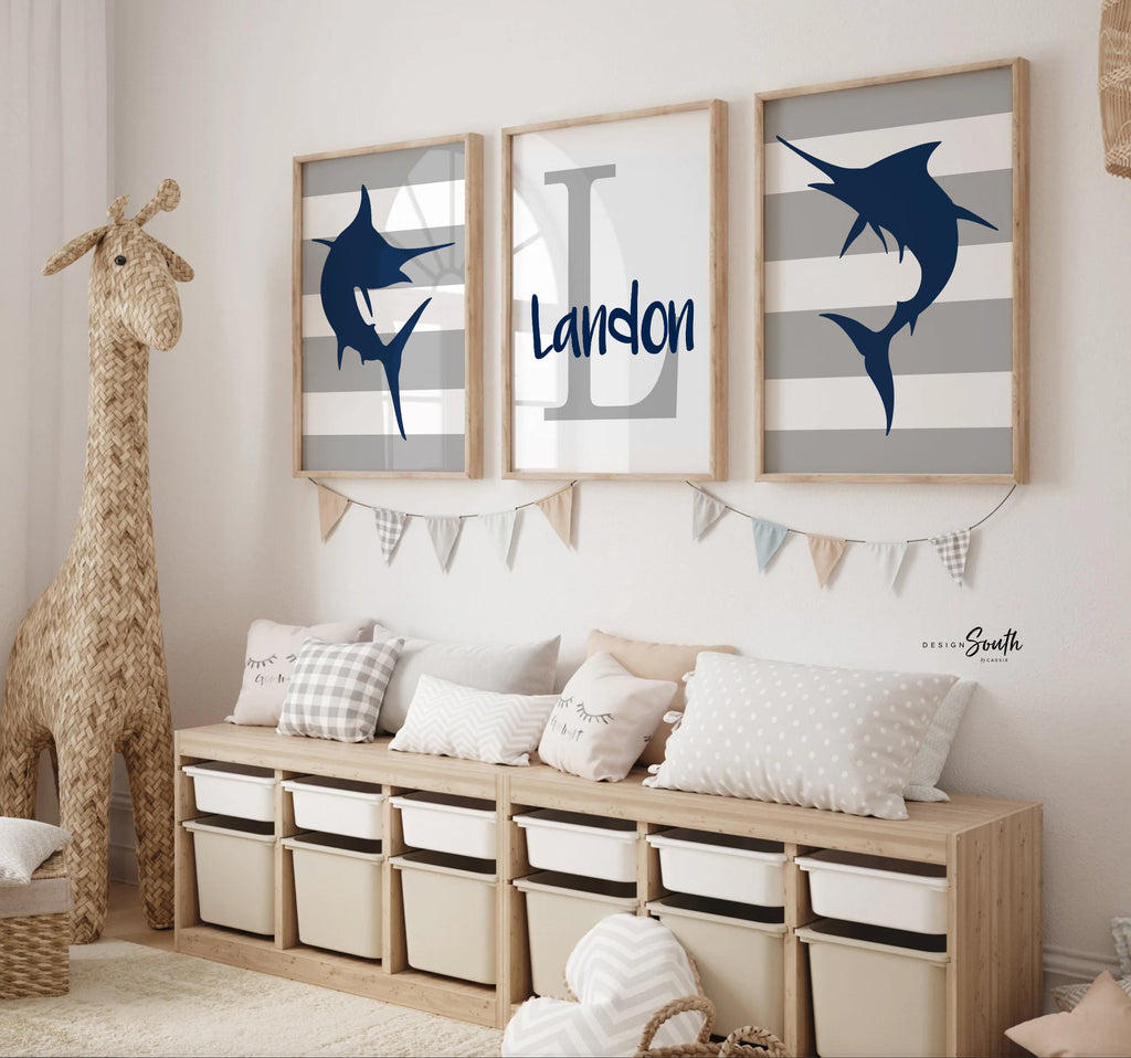 Product description: Marlin prints in navy blue and smoke gray with thick striped backgrounds. Center print is personalized with your child's name and initial. Other color options are also available in my shop.