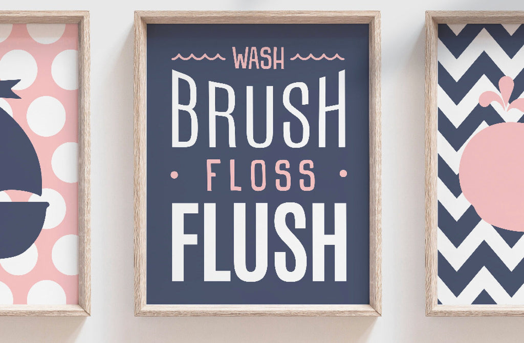 Product description: Sailboat and whale with chevron and polka dot backgrounds. "Wash Brush Floss Flush" quote in pink, white and navy blue. Other color options are available.
