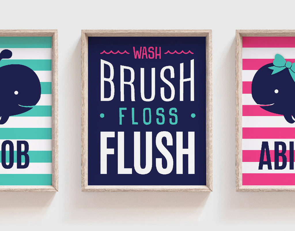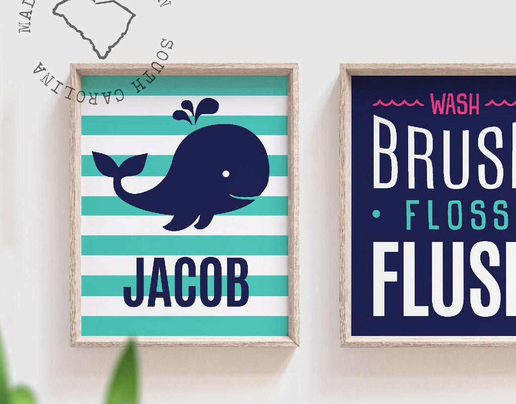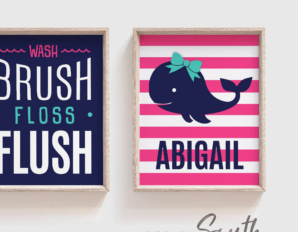 Product description: Personalized whale designs in navy blue with one hot pink and one teal striped background. One whale is accented with a teal hair bow. Matchin quote reading: "Wash, Brush, Floss, Flush." Other color options available.