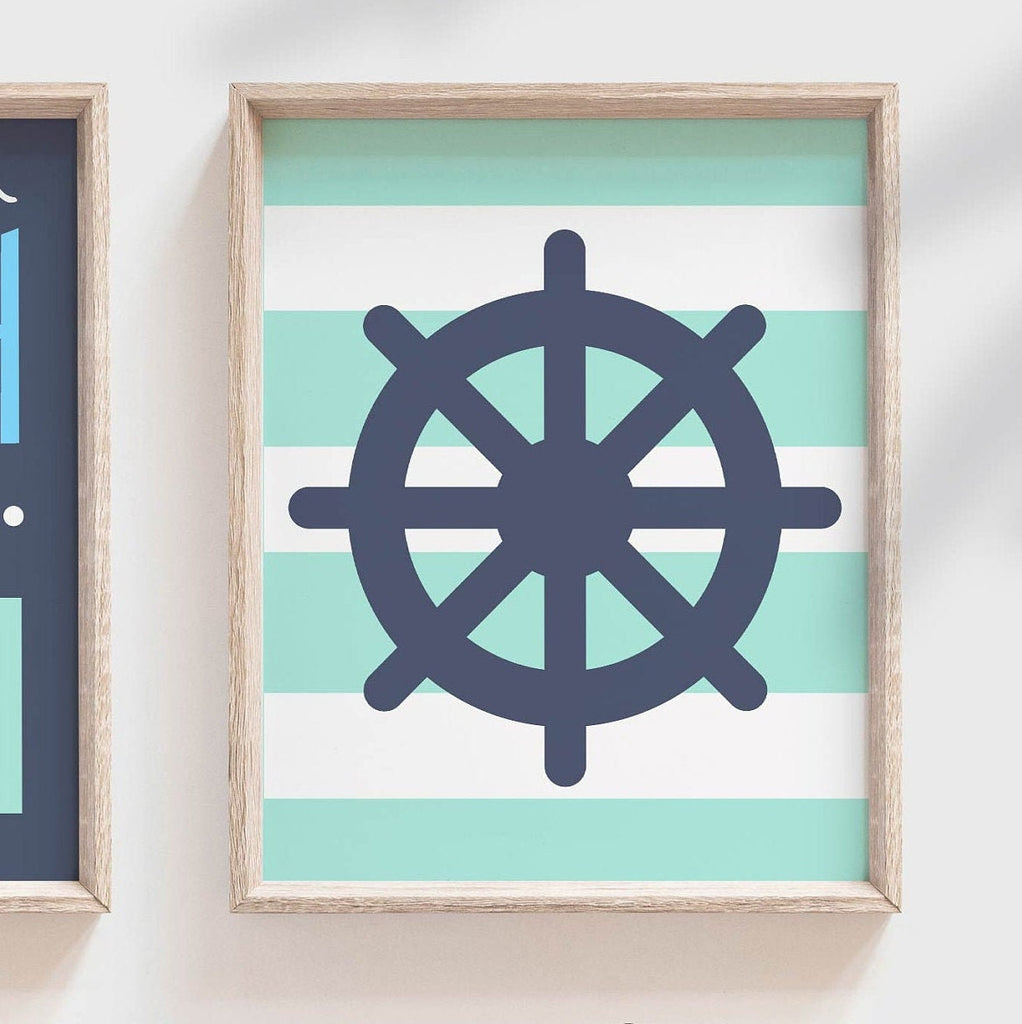 Nautical bathroom decor, boys bathroom decor, bathroom prints, anchor, ship wheel, wash, brush, floss, flush, blue and green bathroom, print