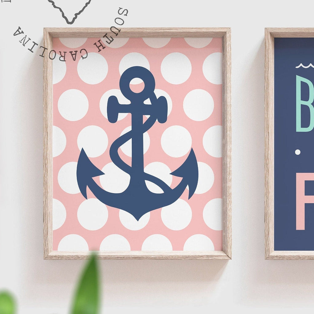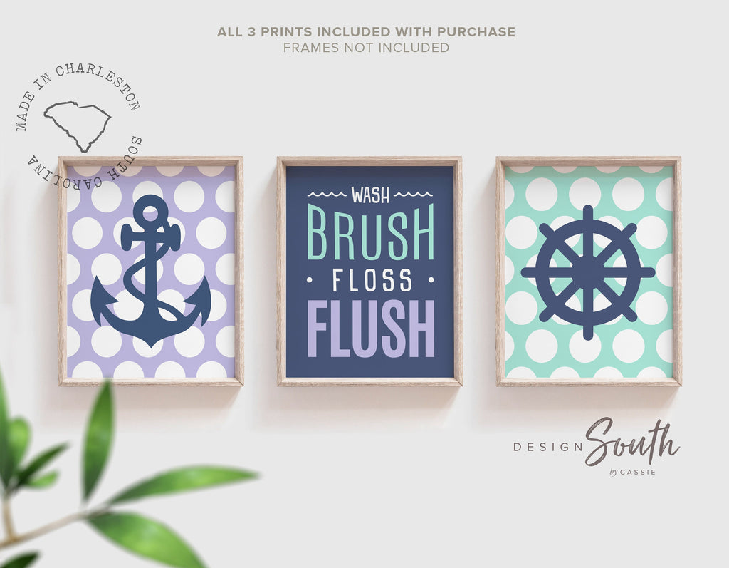 Product description: Nautical (anchor and ship wheel) designs in pink, mint and soft navy with polka dot backgrounds. Matching quote reading: "Wash, Brush, Floss, Flush." Other color options available.