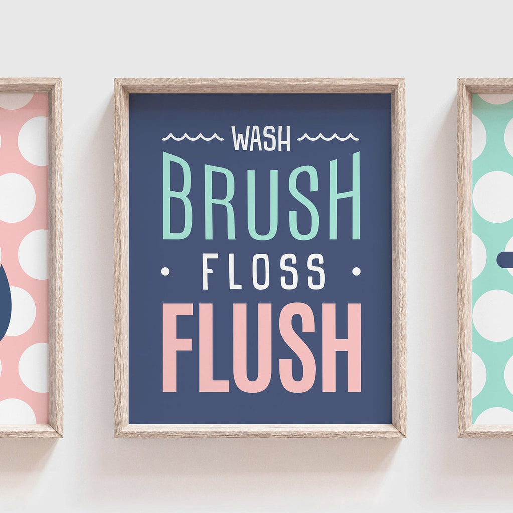 Nautical bathroom decor, girls bathroom decor, pink mint and navy bathroom, wash, brush, floss, flush, girls bathroom print, anchor bathroom