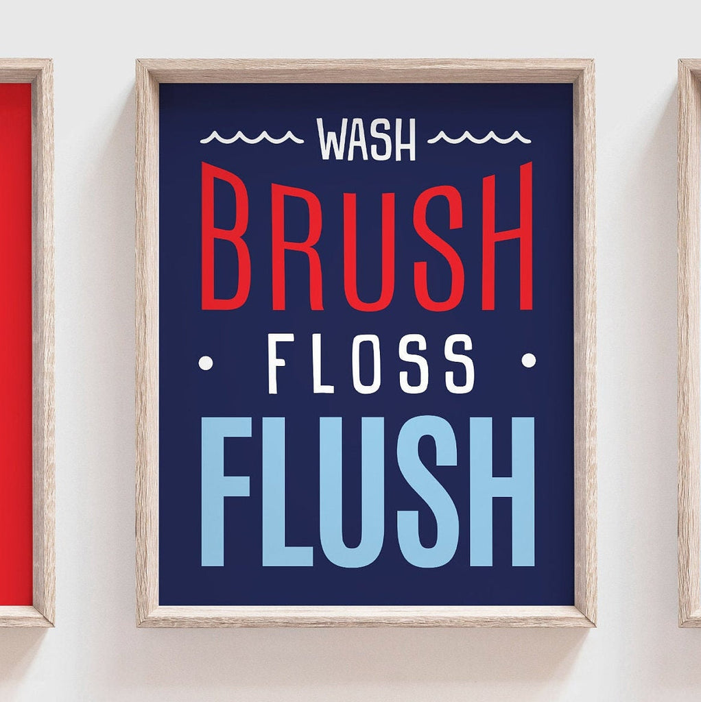 Nautical boys red light blue and navy bathroom, kids bathroom red and navy nautical, wash brush floss flush sign, wall art prints children