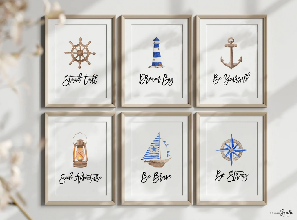 Product description: Nautical themed wall art prints with white backgrounds and inspirational sayings that read, "Be Strong. Be Brave. Dream Big. Be Yourself. Seek Adventure. Stand Tall." Other options are also available in my shop.