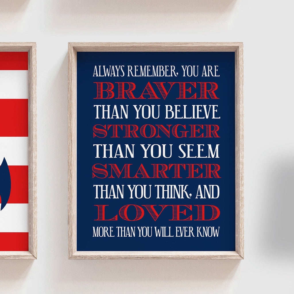 Product description: Nautical theme designs including a whale and anchor in navy blue, smoke and red with thick striped backgrounds. Matching monogram print and quote reading, "Always remember. You are braver than you believe. Stronger than you seem. Smarter than you think. And loved more than you will ever know." Other options are also available in my shop.