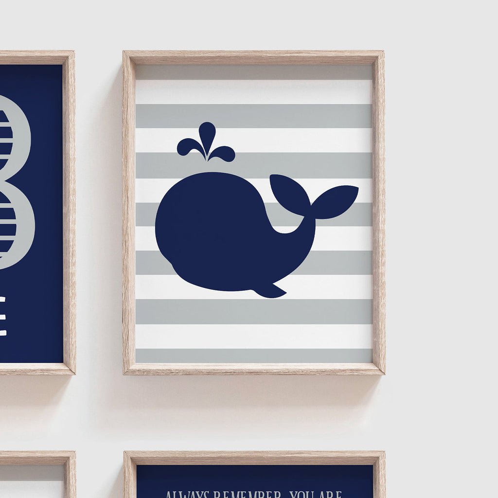 Product description: Whale and anchor design in navy blue and seagull gray with striped backgrounds. Personalized name print and inspirational quote.