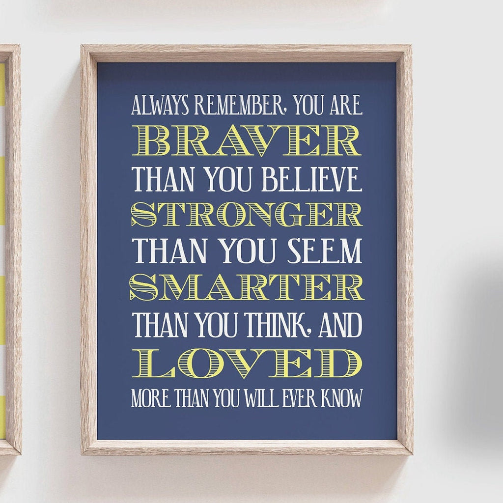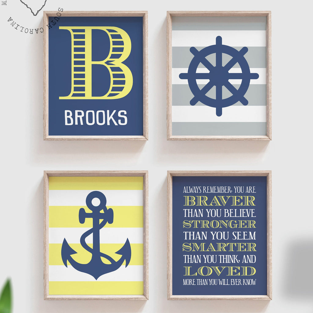 Product description: Anchor and ship wheel with striped backgrounds in shades of buttercup, smoke gray and soft navy. Matching customized name print and nautical quote reading "Remember you are braver than you believe, stronger than you seem, smarter than you think, and loved more than you know." Other color options are available.