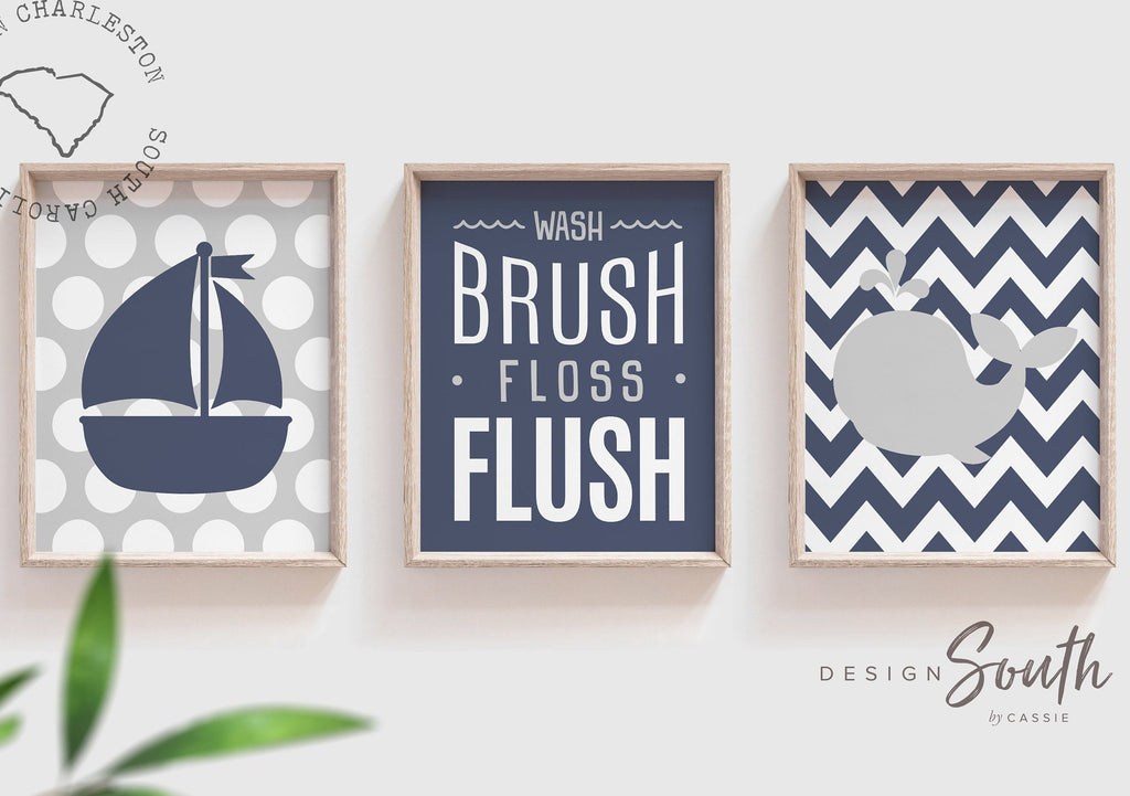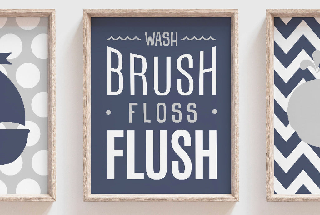 Navy and gray boys bathroom, boys bathroom art, boys bathroom decor, wash brush floss flush, boys navy bathroom, navy bathroom art, navy art
