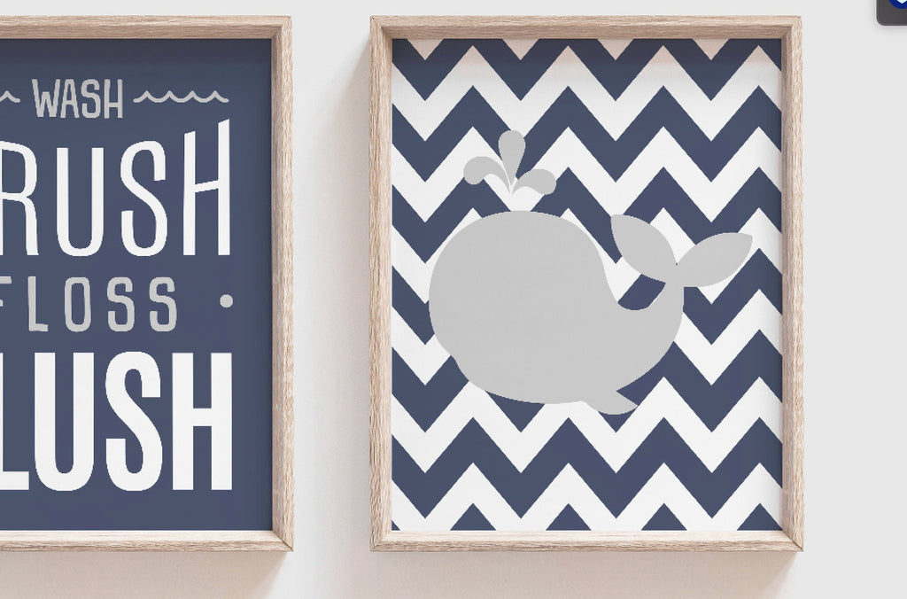 Product description: Sailboat and whale with chevron and polka dot backgrounds. "Wash Brush Floss Flush" quote in gray, white and navy blue. Other color options are available.