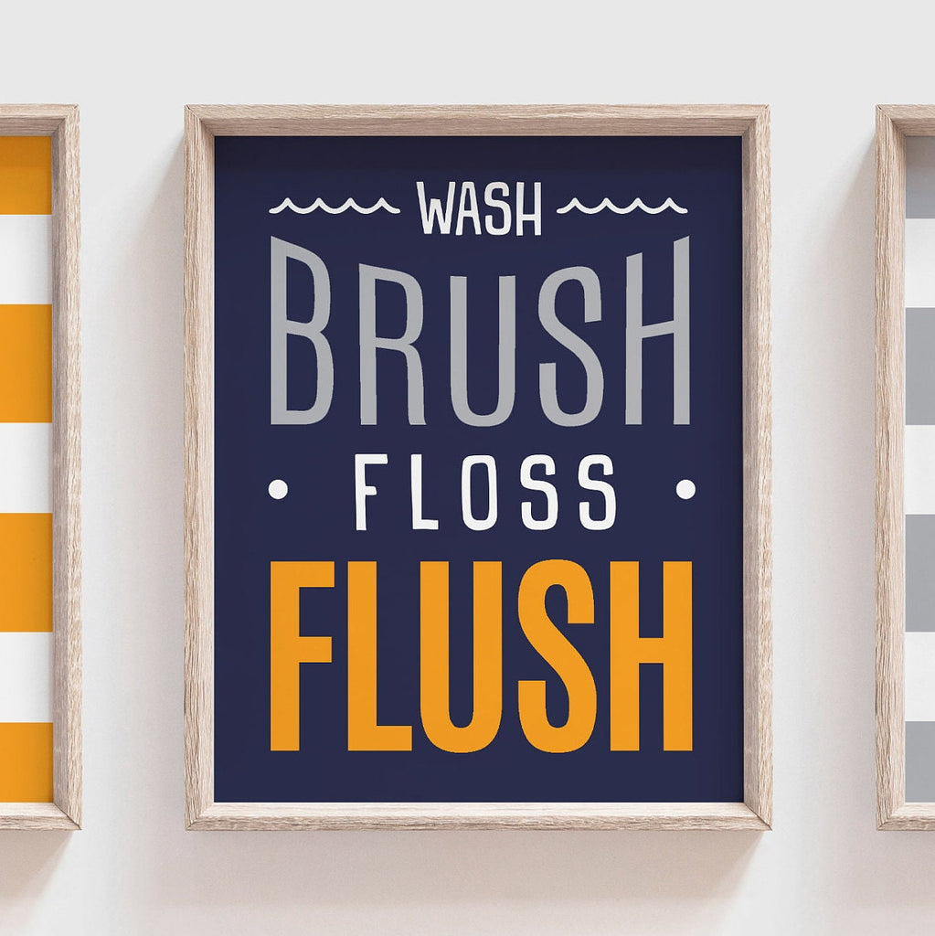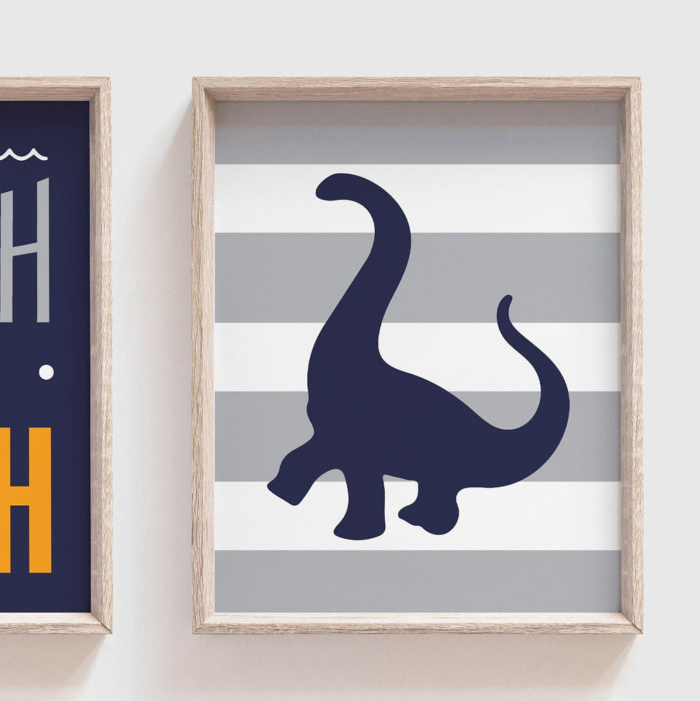 Orange navy and gray toddler bathroom decor, dinosaur boys decor, orange dinosaur bathroom, child bathroom art, kids wall prints wash brush