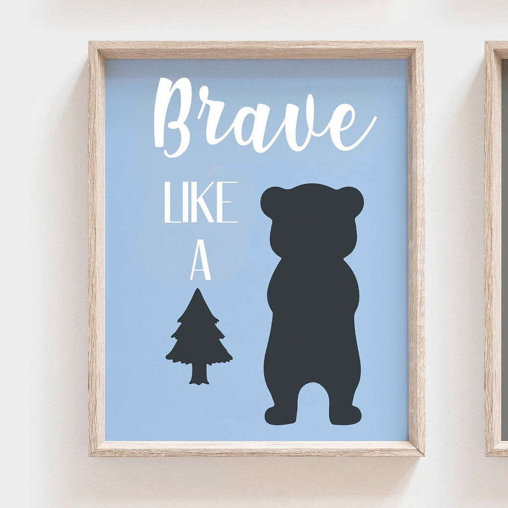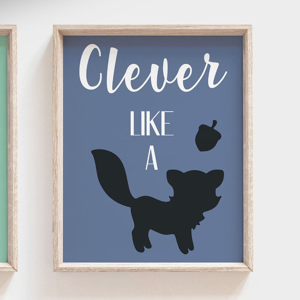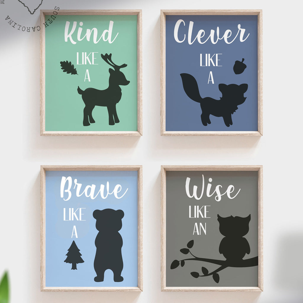 Woodland animal art prints set of four, little boy quotes, nursery decor, adventure woodsy theme, wise owl brave bear clever fox kind deer