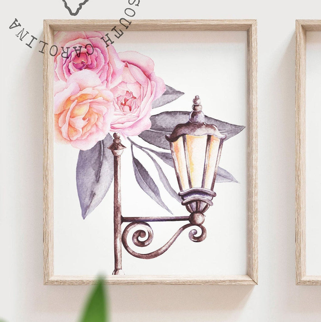Product description: Paris theme watercolor prints featuring The Eiffel Tower, floral french roses, a vintage lantern and a monogram print to be customized with your child's name and initial. Other options are also available in my shop.