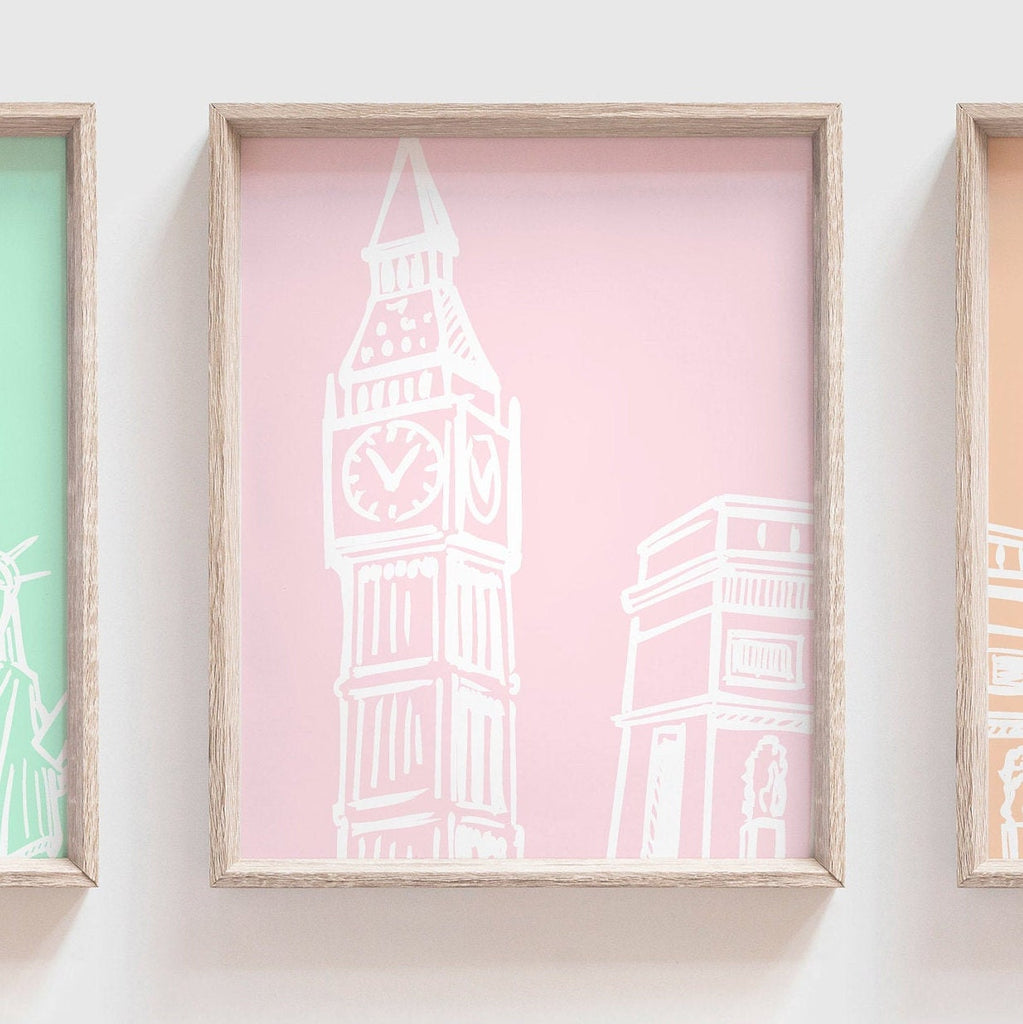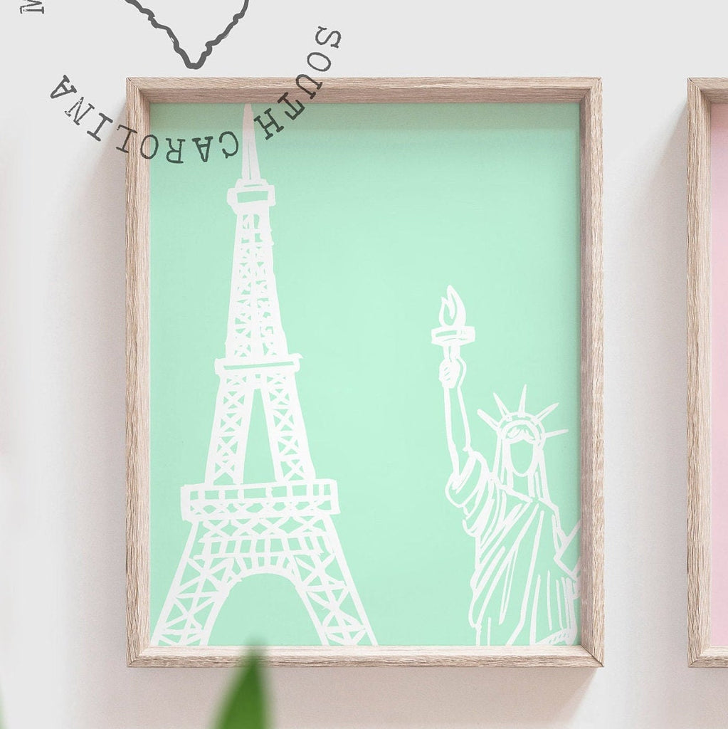 Product description: Travel themed art prints featuring the eiffel tower, leaning tower of pisa, statue of liberty, and big ben clock tower. Colors used in this listing are vibrant mint, cupcake and sugar. Other options are also available in my shop.