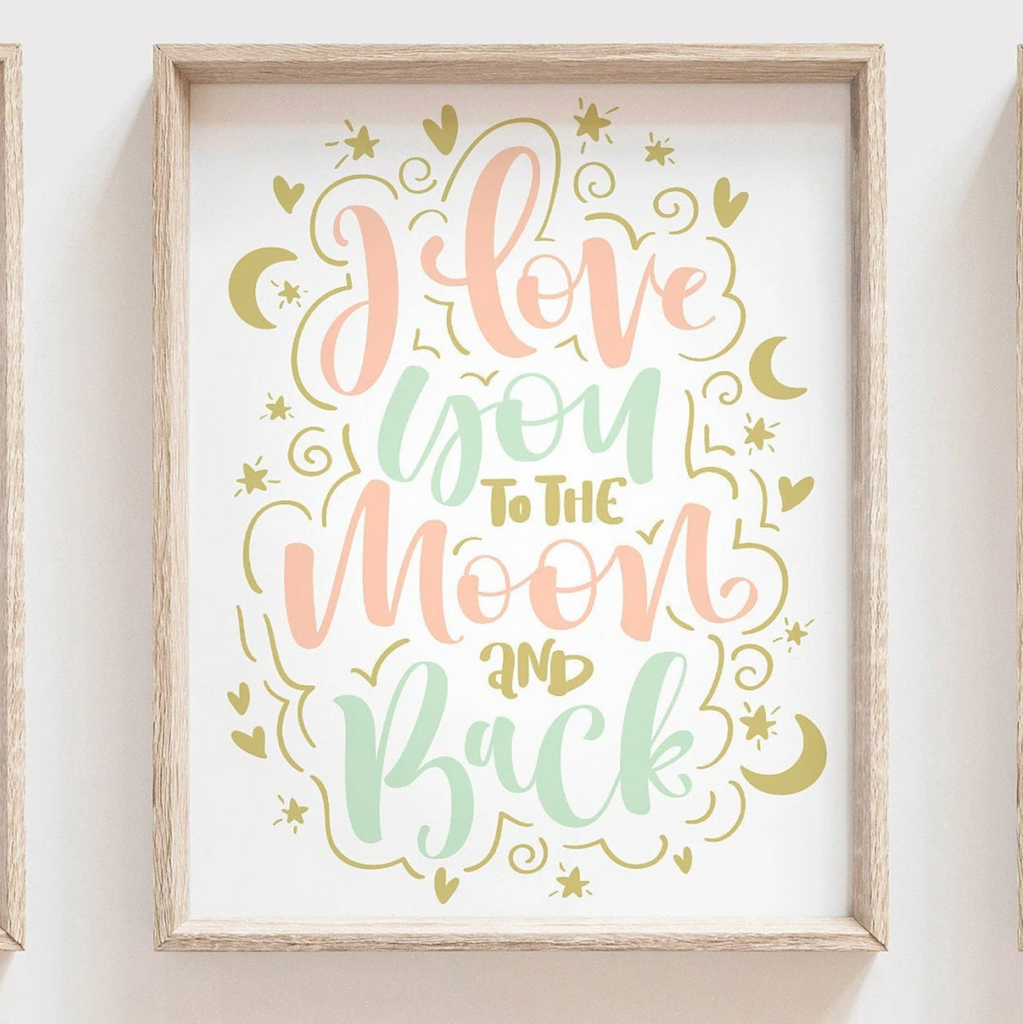 Product description: Quote reading, "Twinkle Twinkle Little Star" in peach, mint and faux gold sparkle with matching moon and cloud prints. Alternative option features "I love you to the moon and back."