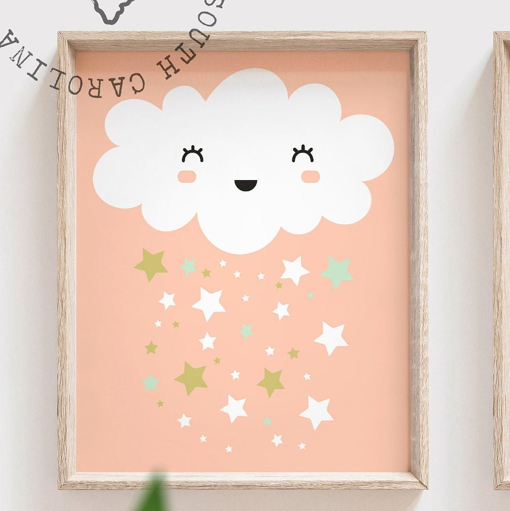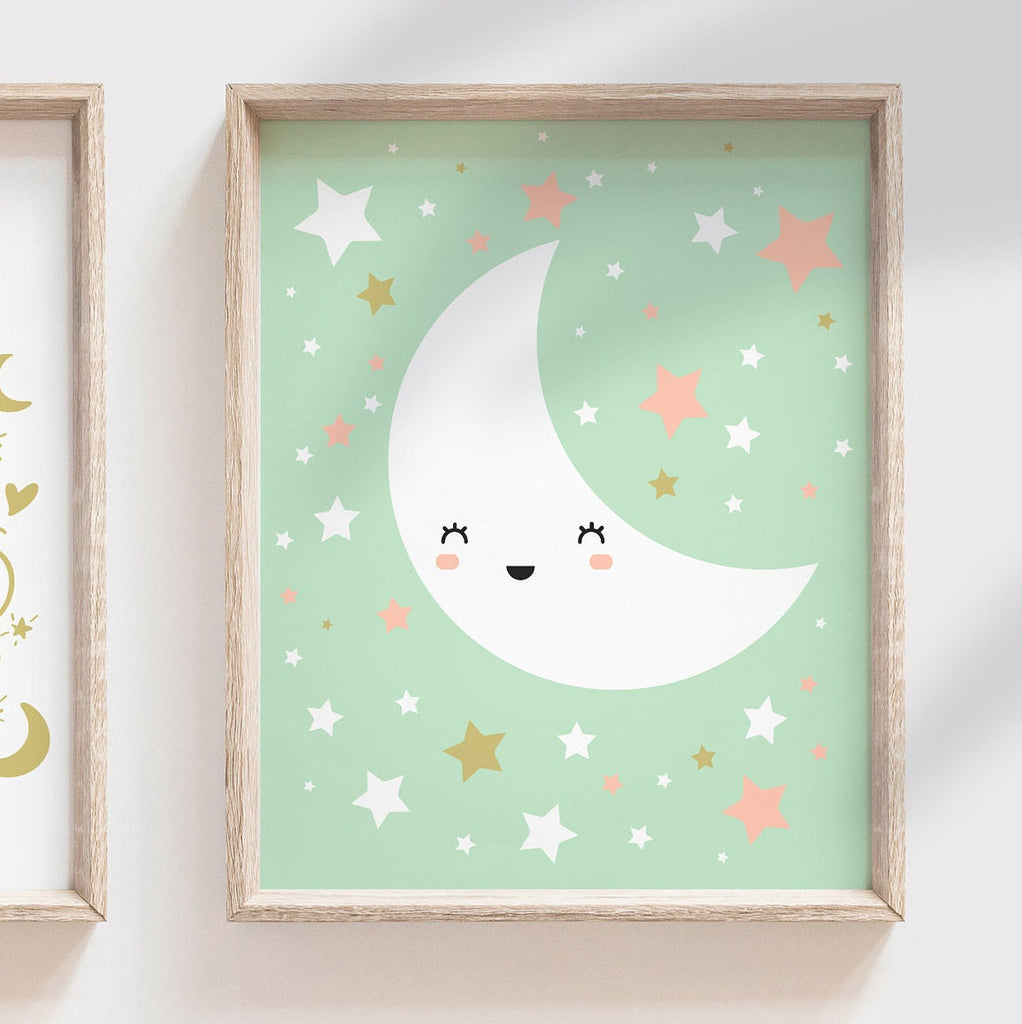 Coral mint gold, twinkle twinkle, moon cloud stars, baby girl nursery, gift for baby shower, cloud stars baby shower, little girl's room art