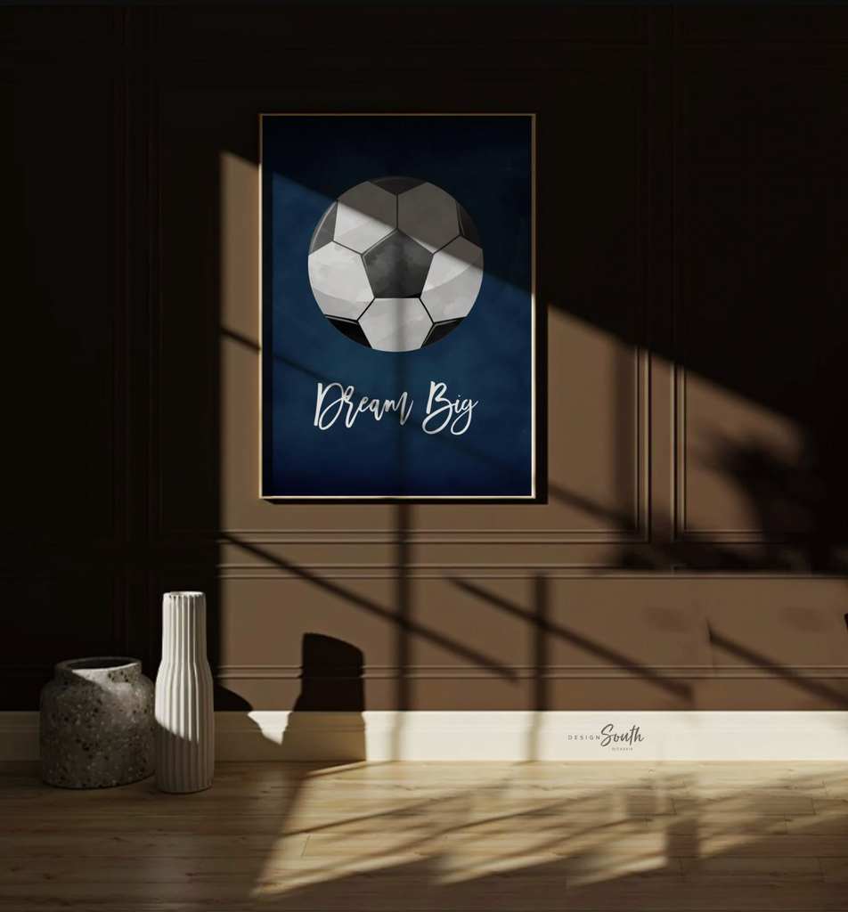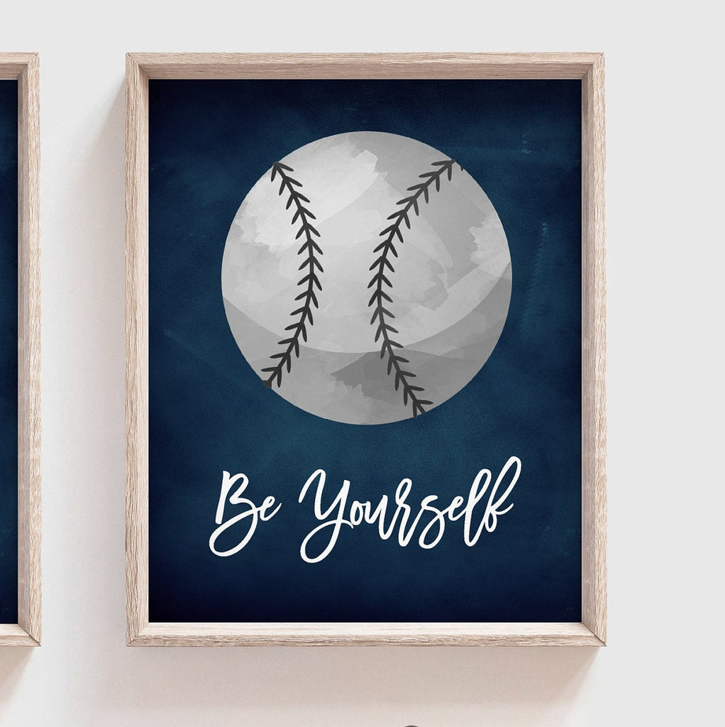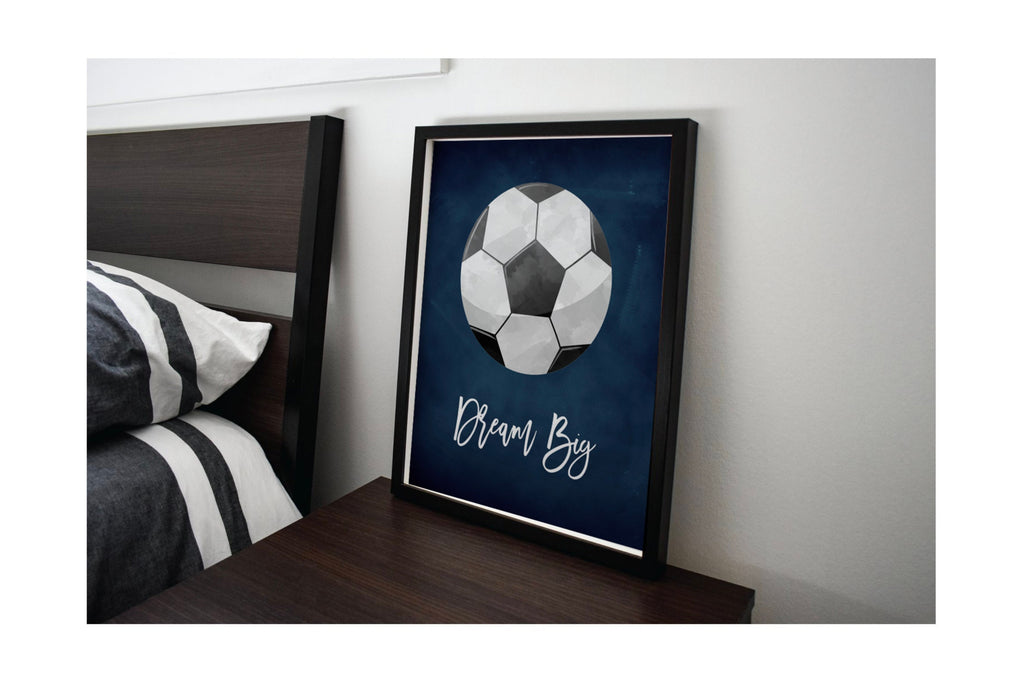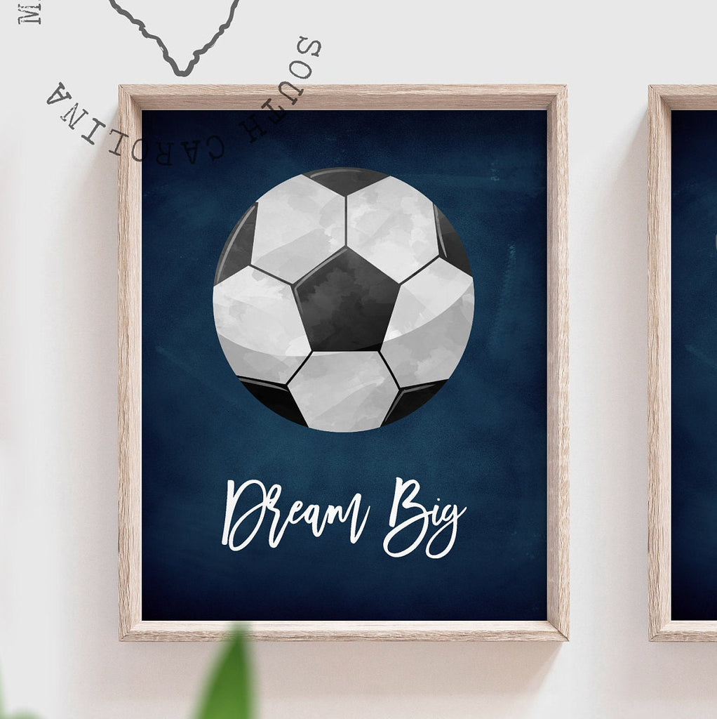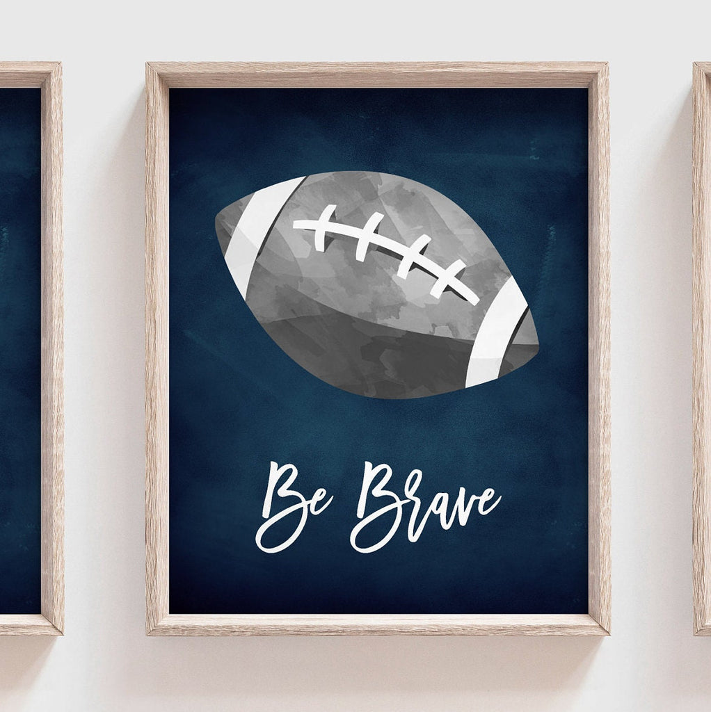 Product description: Sports theme watercolor prints including a soccer ball, football, and baseball in black and white with navy blue chalkboard textured backgrounds. Prints read, "Dream Big, Be Brave, Be Yourself." Other options are also available in my shop.