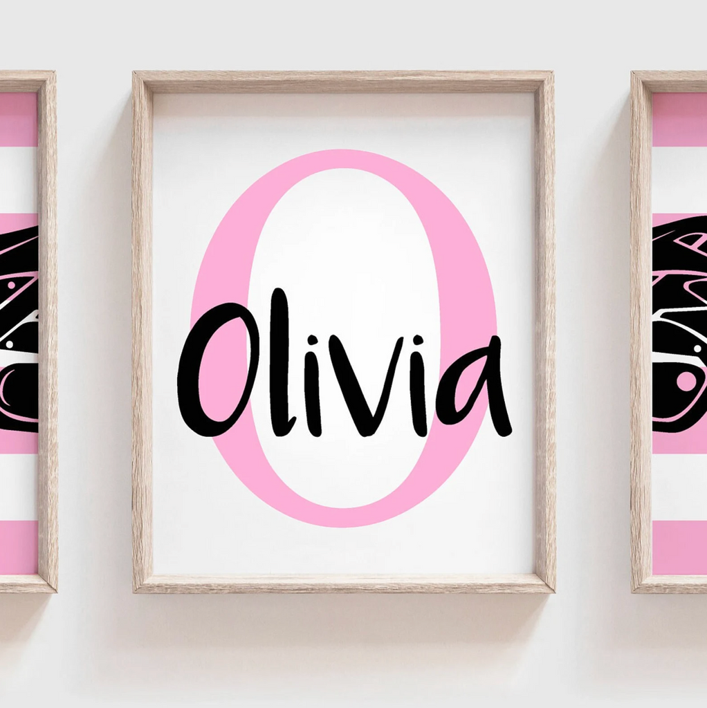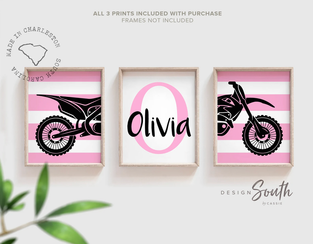 Product description: Dirt bike triptych prints in black and lollipop pink with thick striped backgrounds and matching personalized print to be customized with your child's name and initial. Other options are also available in my shop.