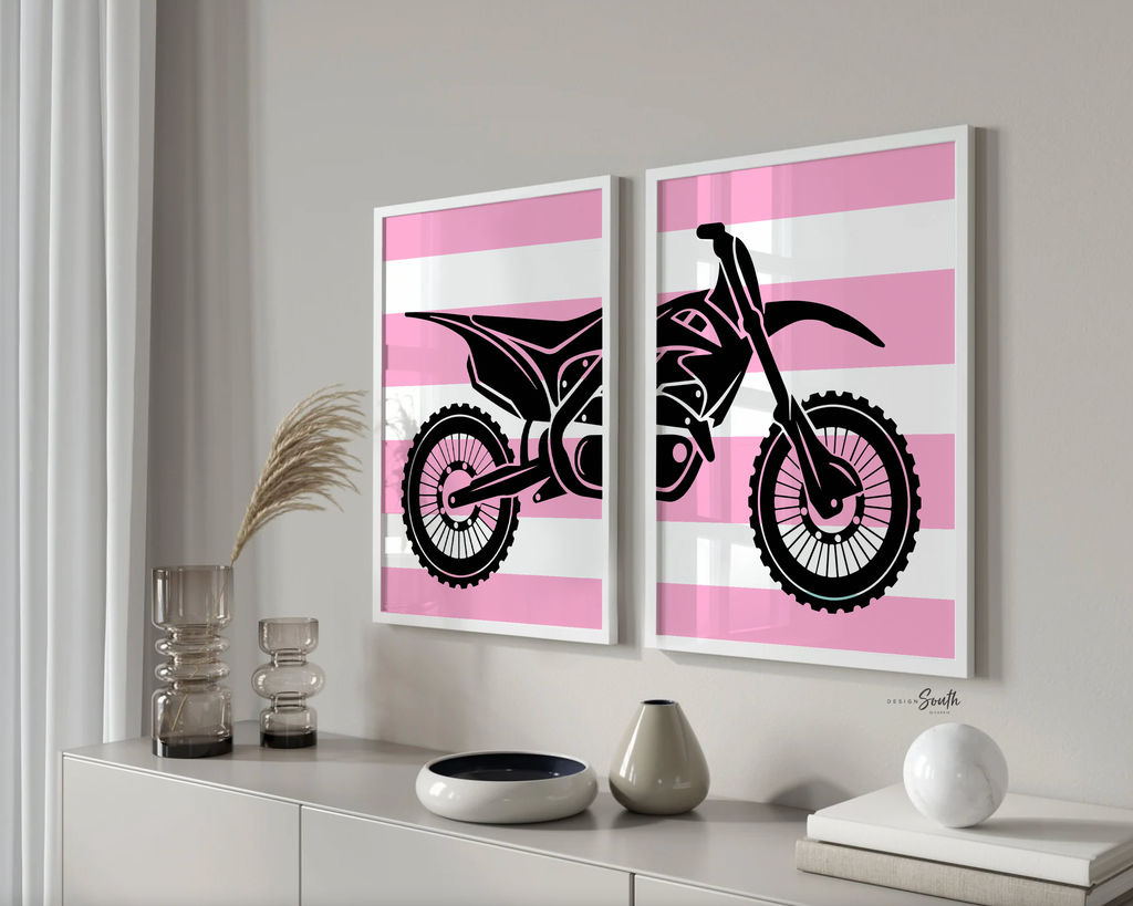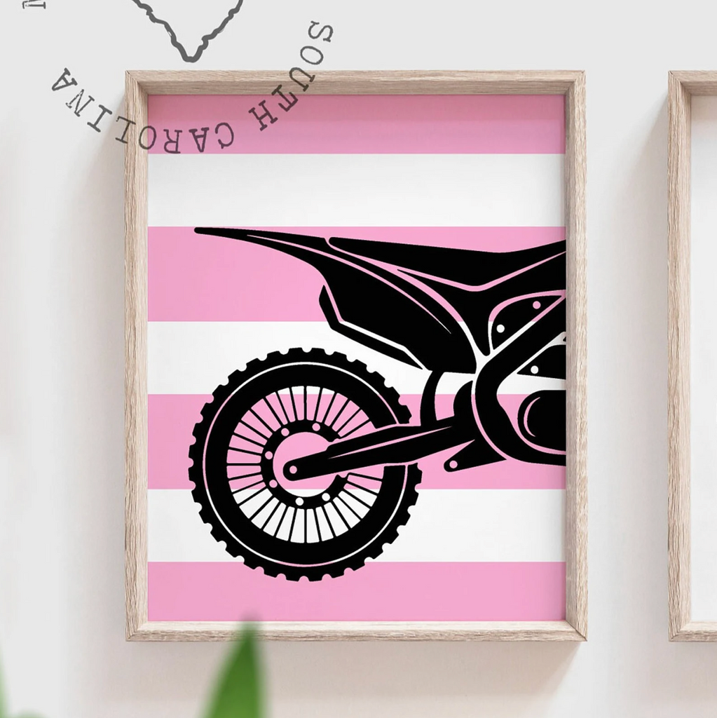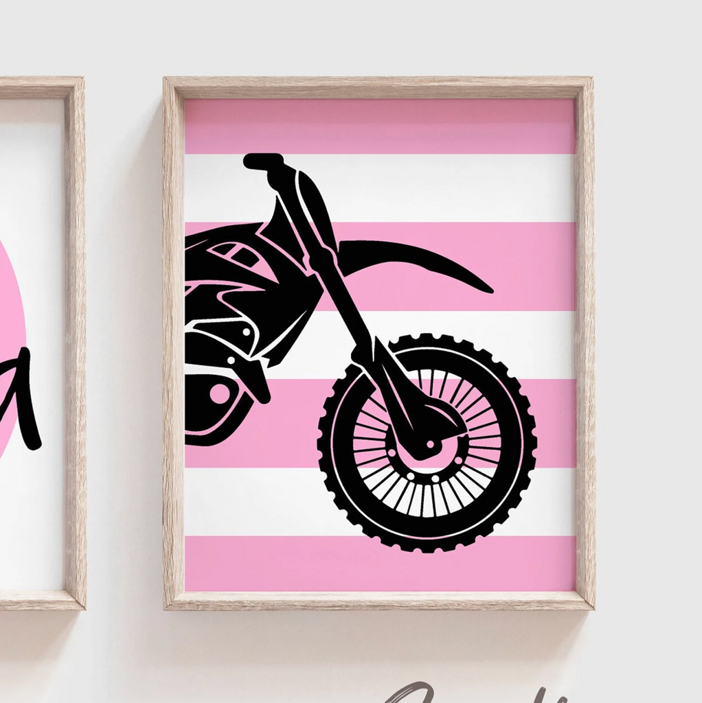 I take pride in creating all of my designs. These contemporary dirt bike wall art prints will redefine the walls of a girl's nursery, playroom or bedroom. Each design is curated with a passion and vision to create inspired spaces for you and your little ones.