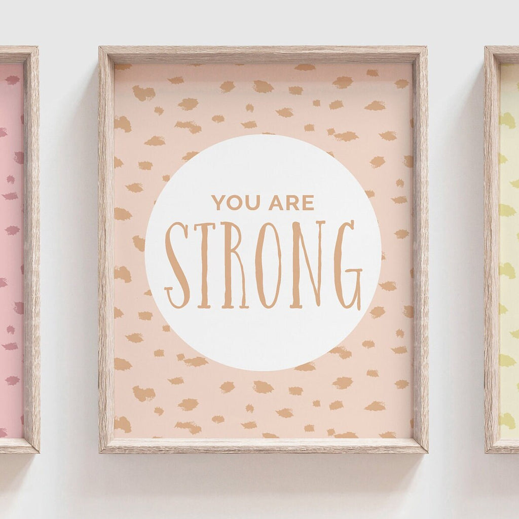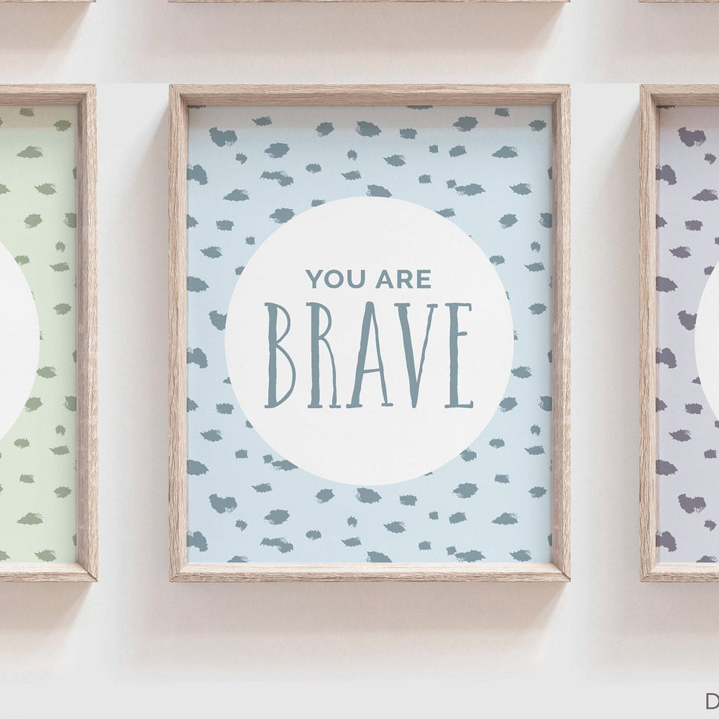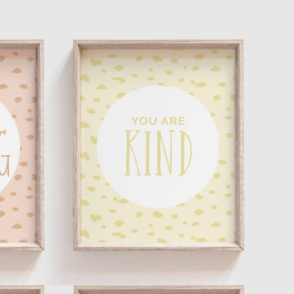 Product description: Pastel colored prints featuring ink splatter patterns and inspirational quotes reading, "You are kind. You are brave. You are strong. You are loved. You are unique." Other options are also available in my shop. Other options are also available in my shop.