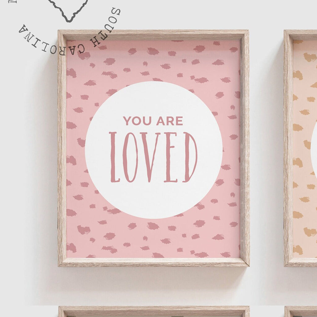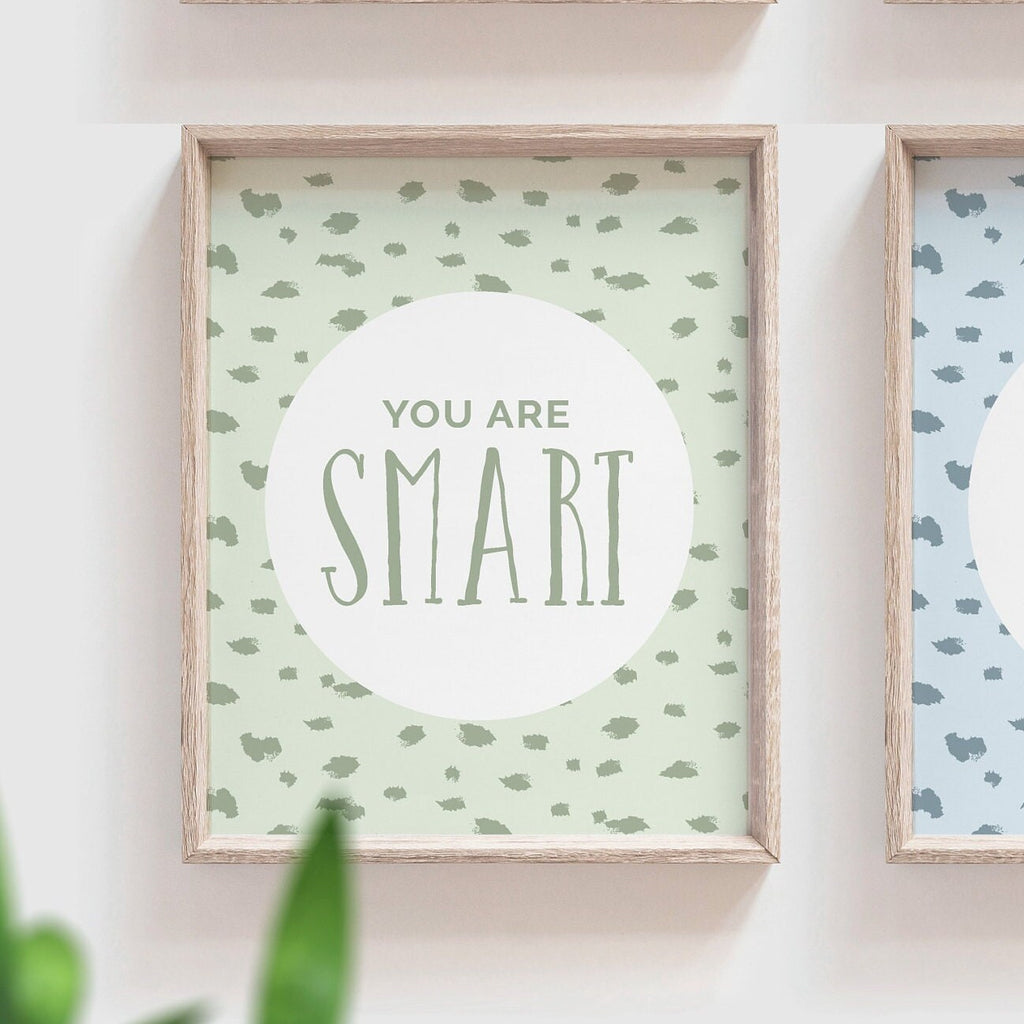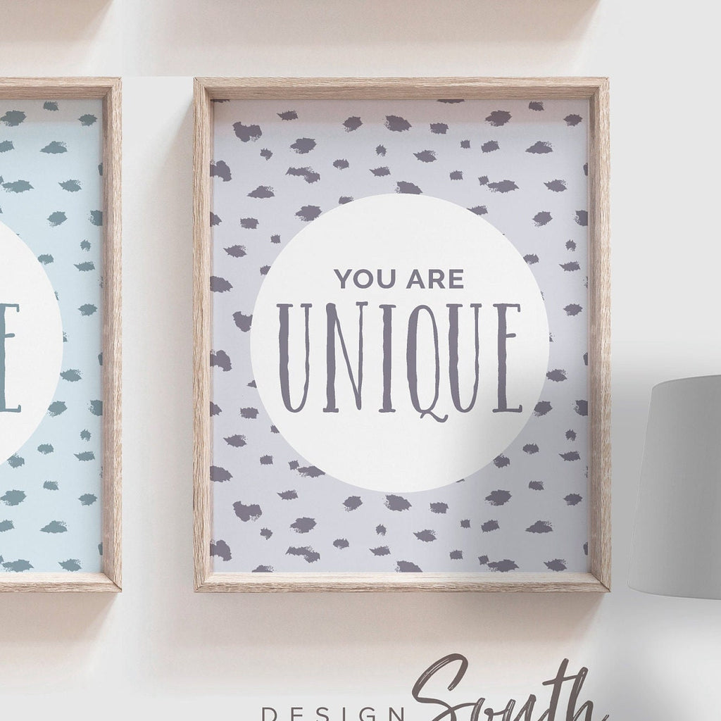 Product description: Pastel colored prints featuring ink splatter patterns and inspirational quotes reading, "You are kind. You are brave. You are strong. You are loved. You are unique." Other options are also available in my shop. Other options are also available in my shop.