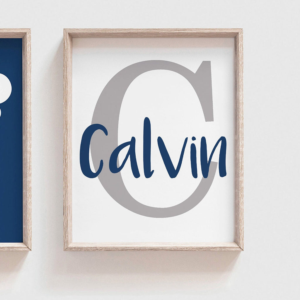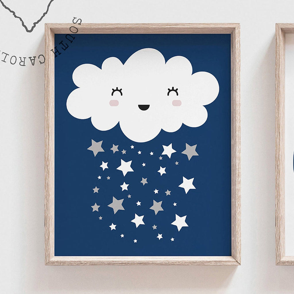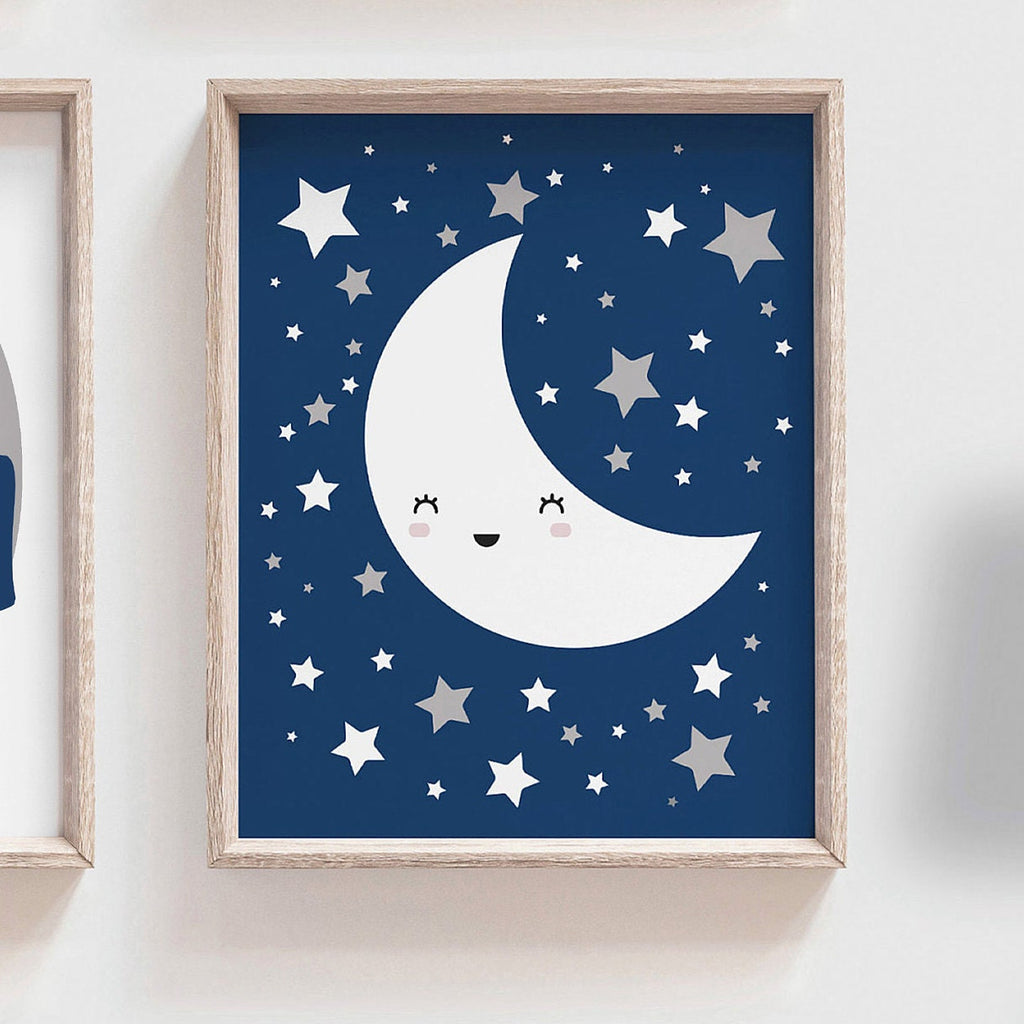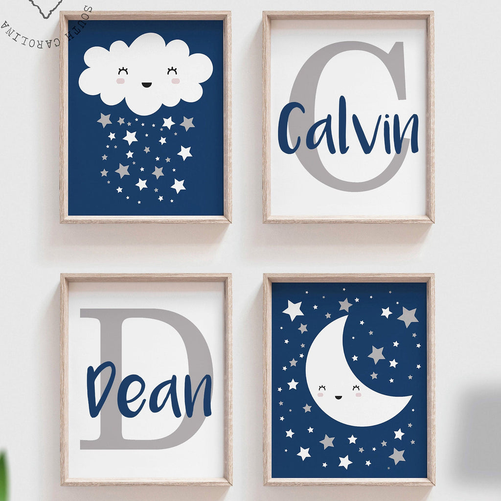 Shared boy bedroom, twin boys nursery wall art prints, navy blue and gray celestial theme moon stars clouds, personalized name and initial