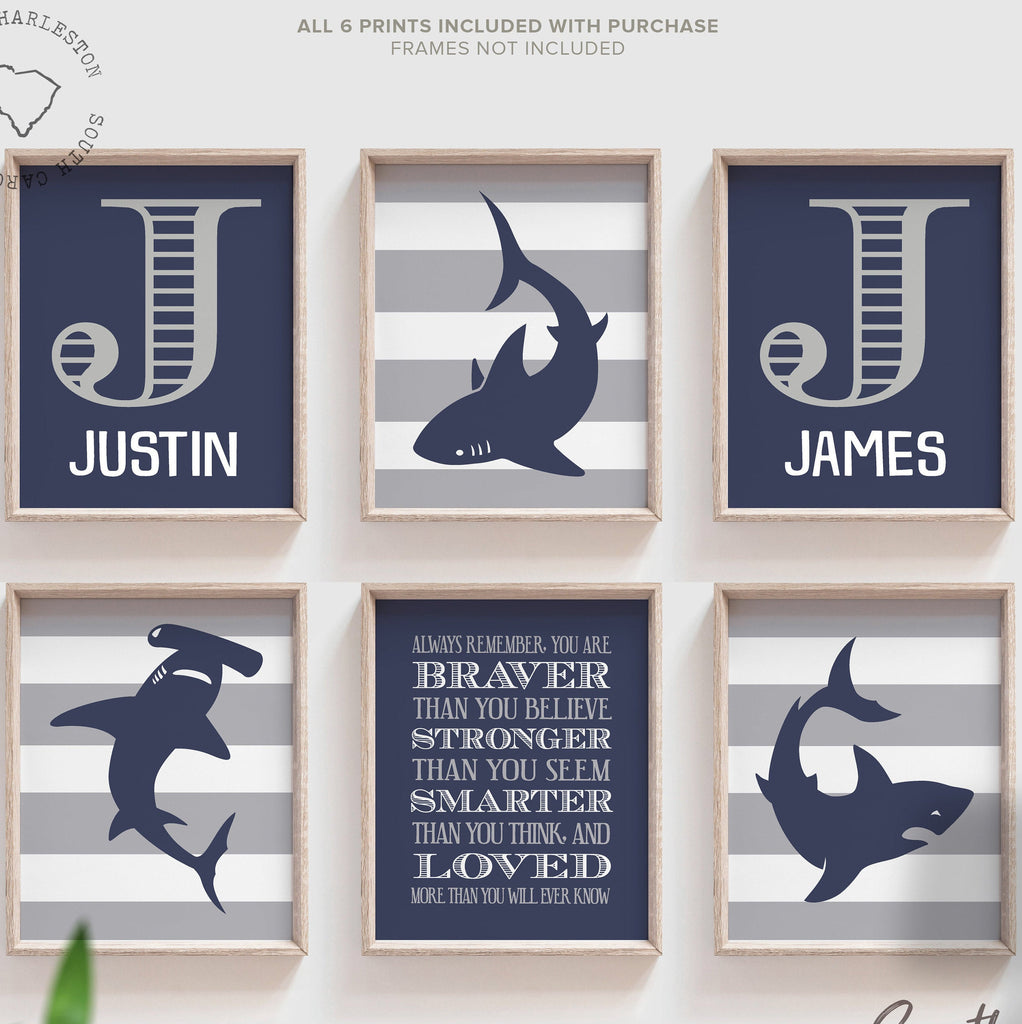 Product description: Shark themed prints in soft navy and smoke with matching monogram prints and inspirational quote reading, "Always remember. You are braver than you believe. Stronger than you seem. Smarter than you think. And loved more than you will ever know." Other options are also available in my shop.