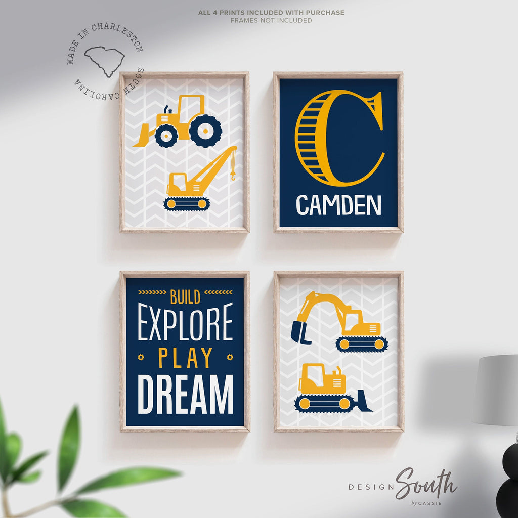 Product description: Construction truck art prints in navy blue, seagull and saffron with matching print reading, "Build. Explore. Play. Dream." Matching personalized print to be customized with your child's name. Other options are also available in my shop.
