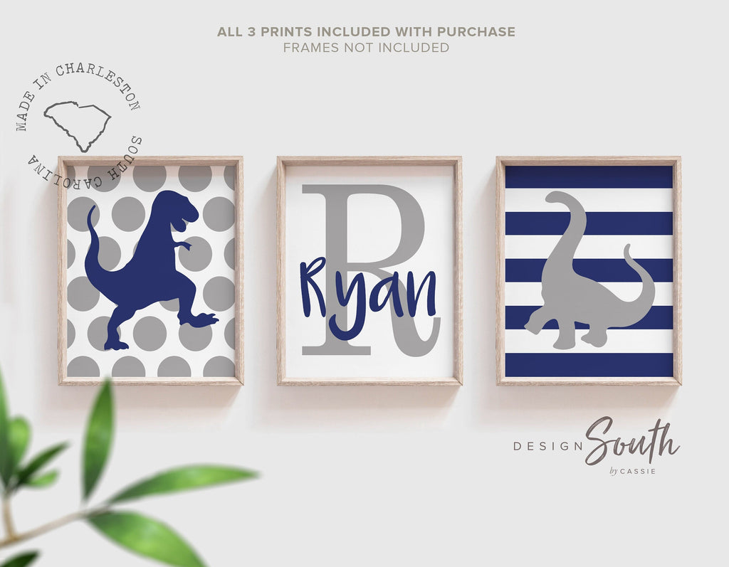 Navy blue and gray boys dinosaur art, personalized dinosaur bedroom, baby boy dinosaur wall art, personalized dinosaur nursery wall decor