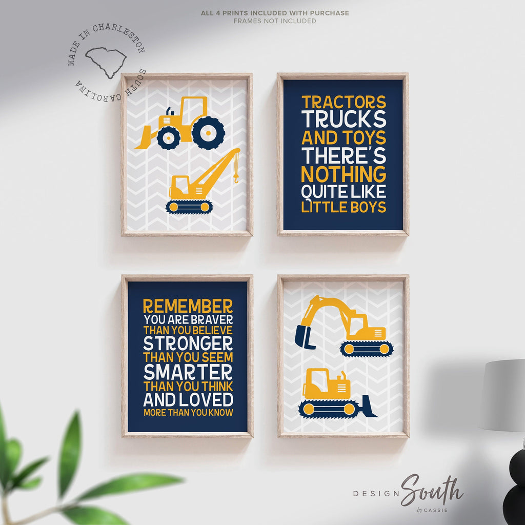 Tractors Trucks & Toys Theres Nothing Quite Like Little Boys, Remember You Are Braver, digger art print, construction trucks room wall decor