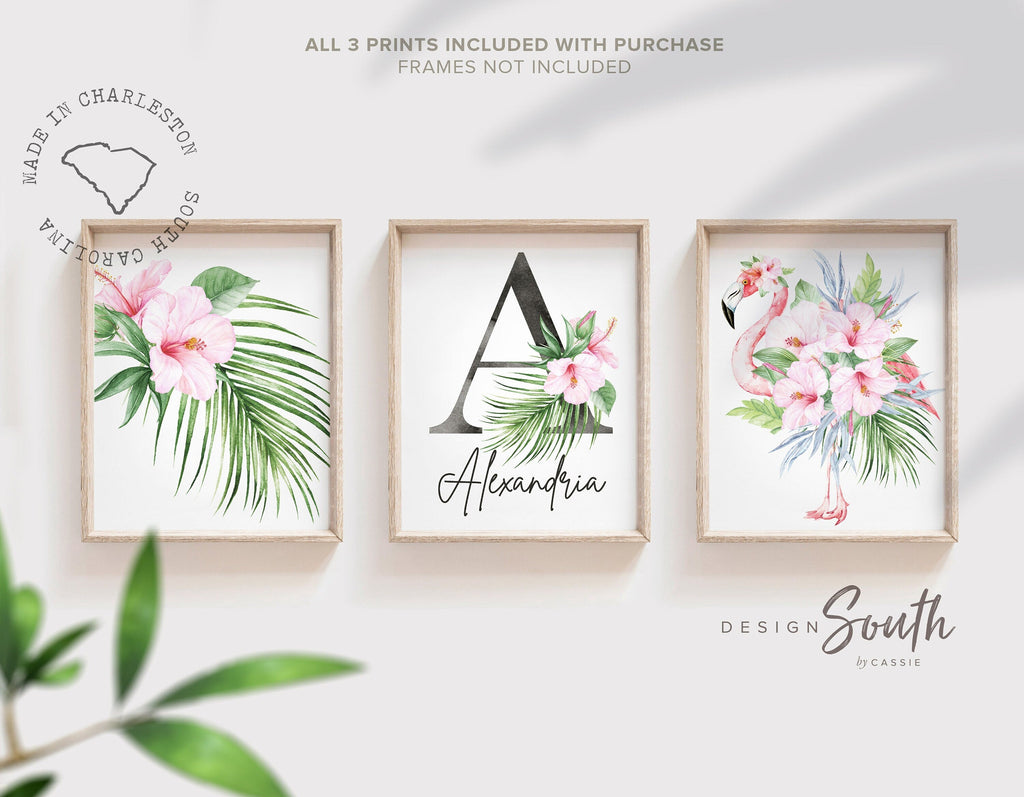 Girl nursery decor, flamingo tropical leaves nursery art, jungle theme botanical baby girl wall, coastal nursery decor, pink tropical decor