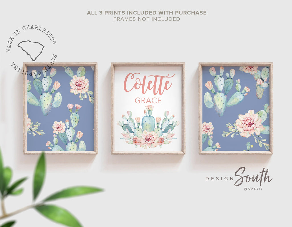 Product description: Desert cactus theme prints in detailed watercolor with bloomed cactus flowers and matching name print to be customized with your child's first and middle name. Background color is in pigeon blue. Other options are also available in my shop.