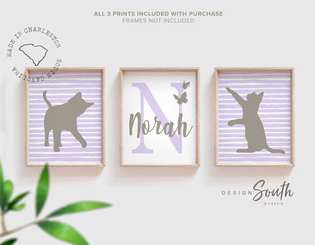 Kitten art print for nursery, little girl's room kitten decor accessories, lilac purple and gray, cat girl room, kitten posters personalized