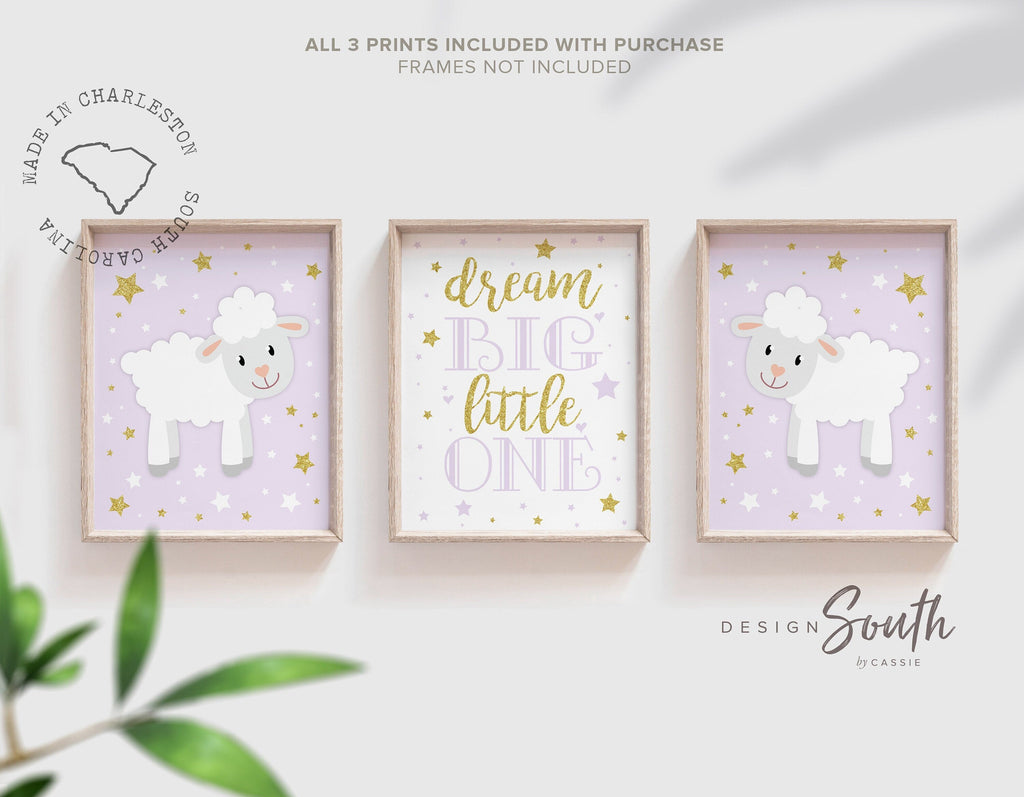 Product description: Baby lamb designs in lilac with gold sparkles. Matching quote reading "Dream Big Little One." Other color options available. Note: The item listed is created digitally. Gold glitter nor sparkly paper was used in this design. High resolution photography of sparkles was used to create a 3D appearance of sparkles.