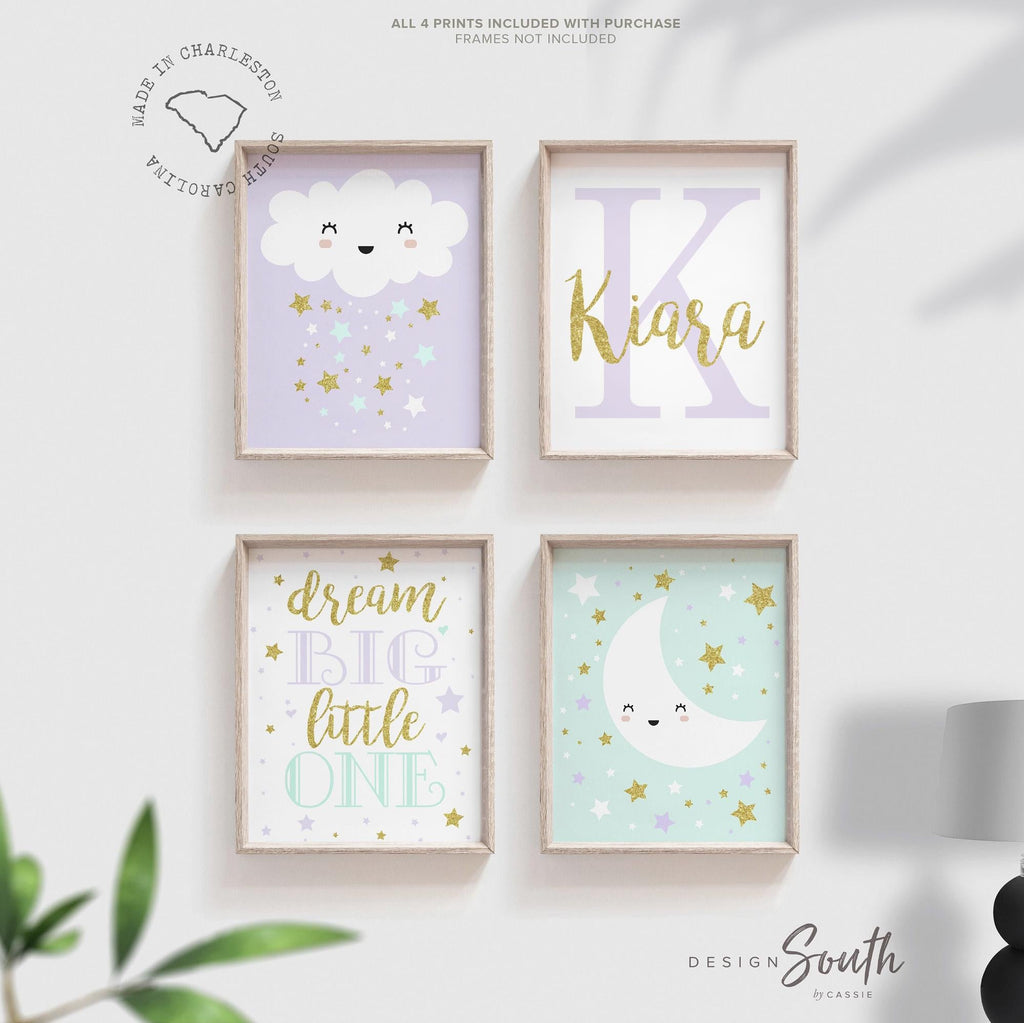 Lilac and mint girls room, baby shower gift girl, personalized girls art, decor moon cloud stars, wall art for girls, bedroom art for girls
