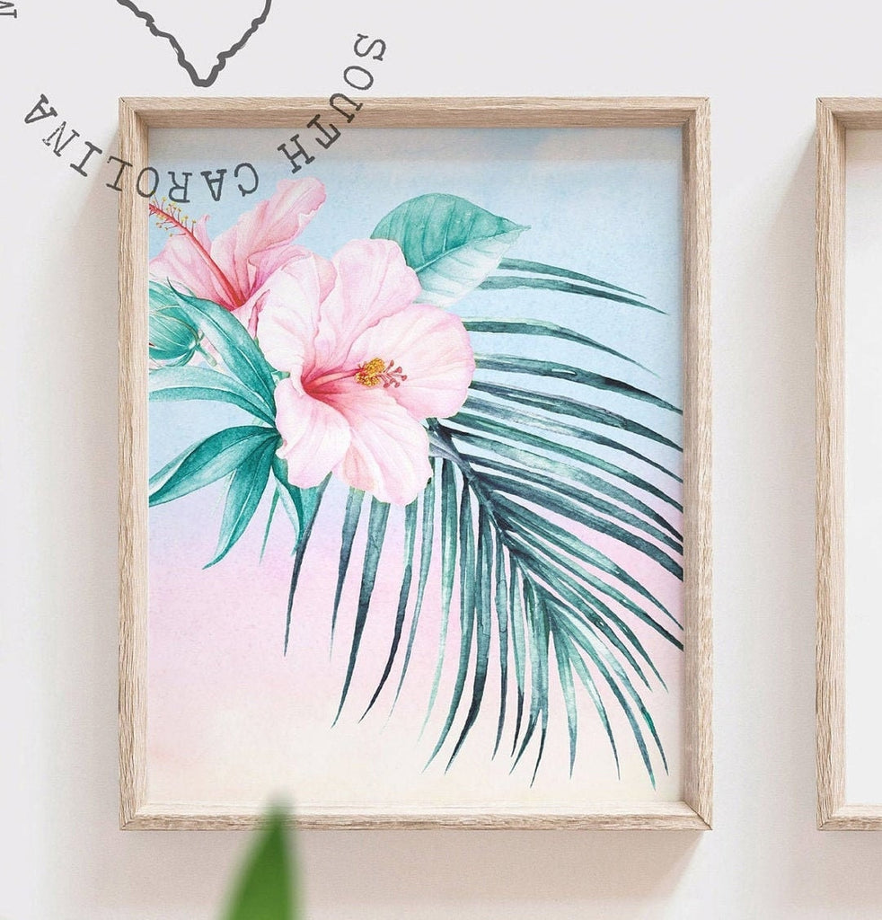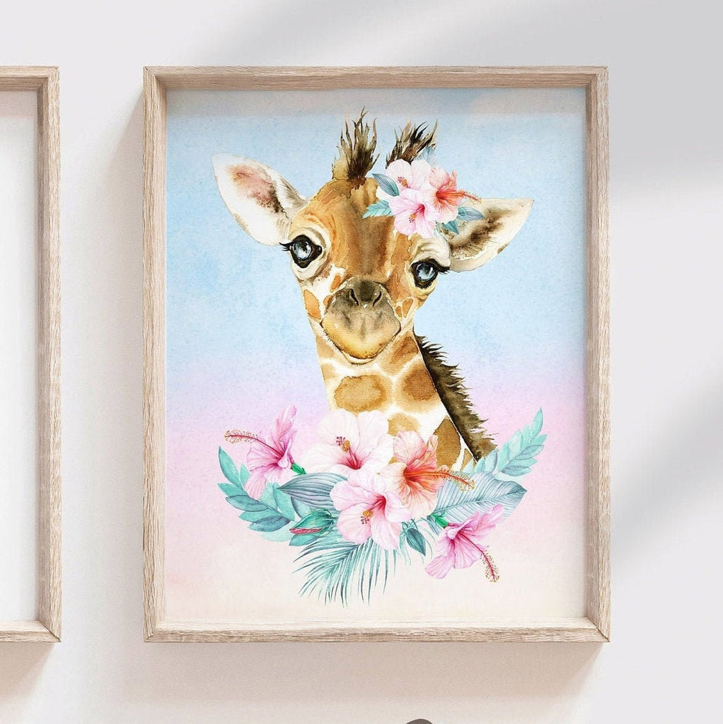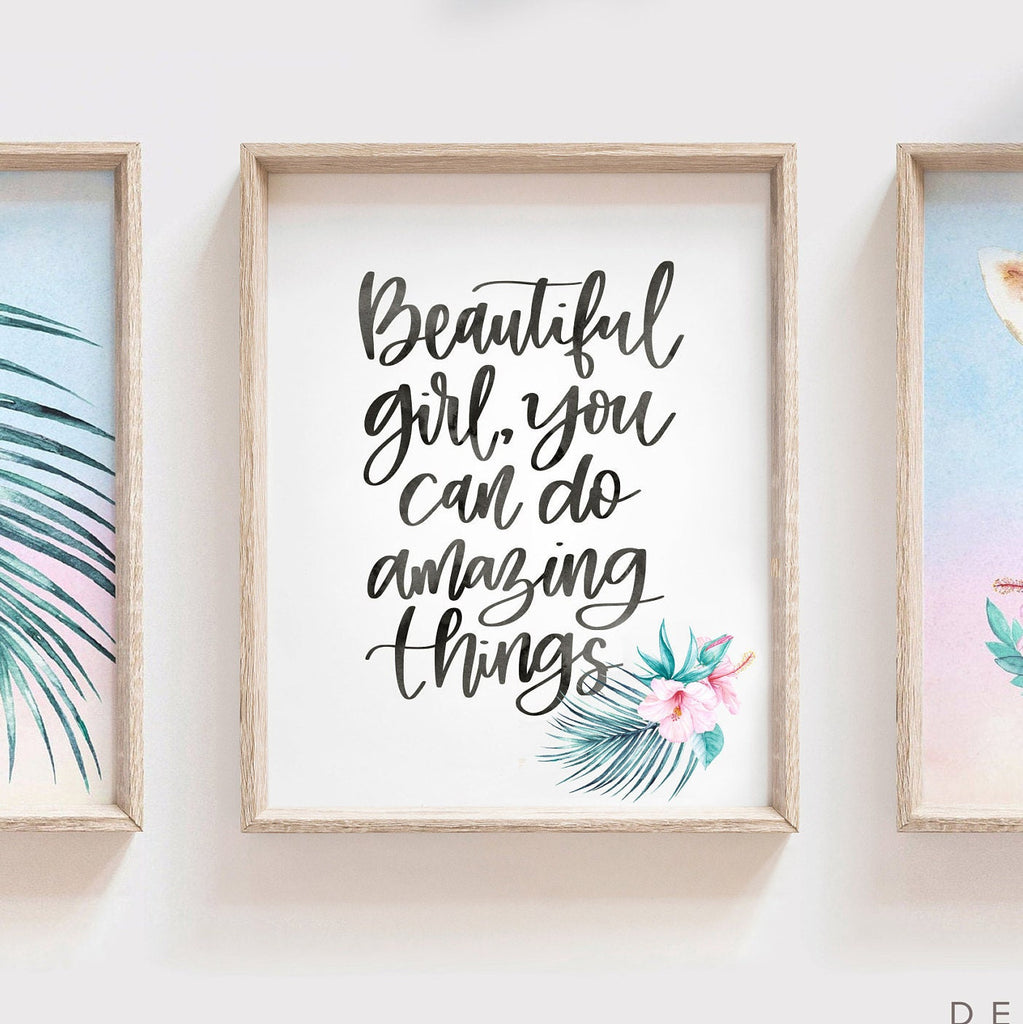 Product description: Tropical theme watercolor prints featuring a giraffe, hawaiian flowers, palm leaves and matching inspirational quote print reading, "Beautiful girl, you can do amazing things." Other options are also available in my shop.