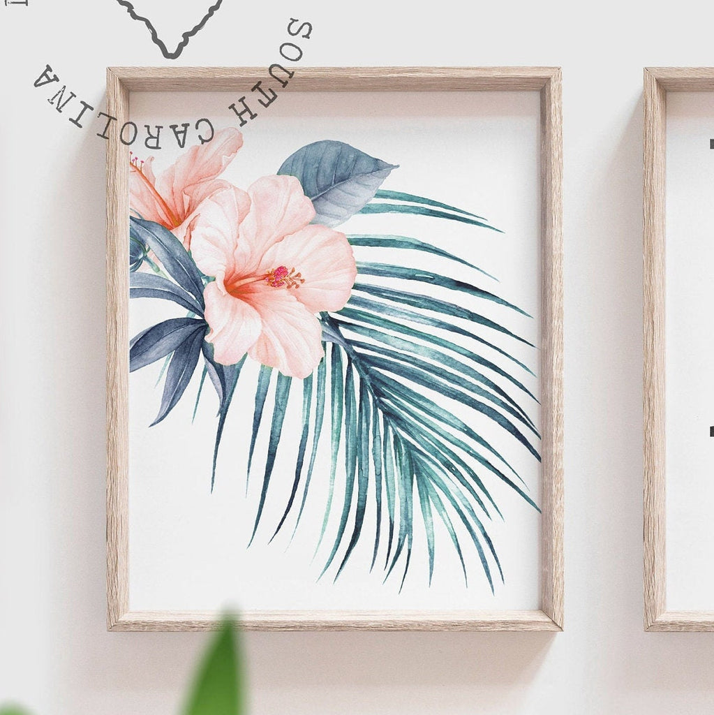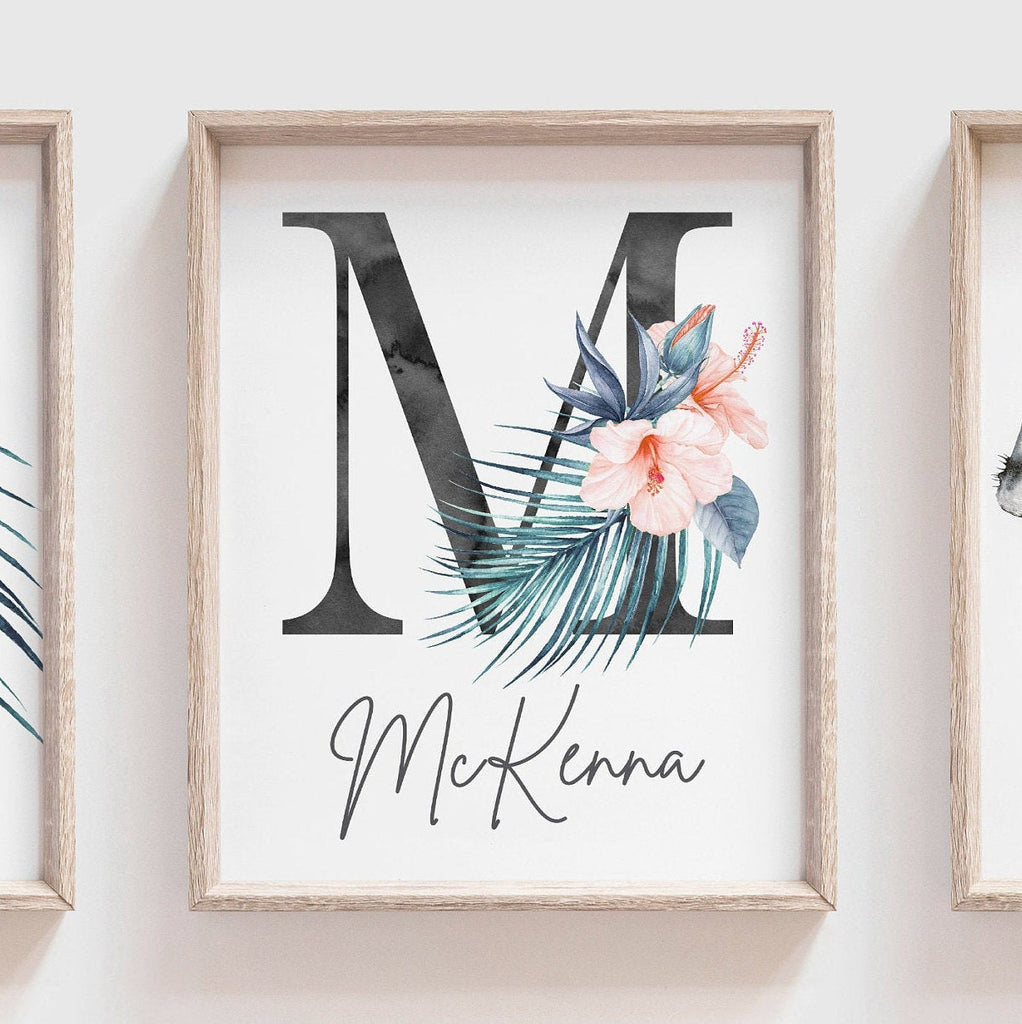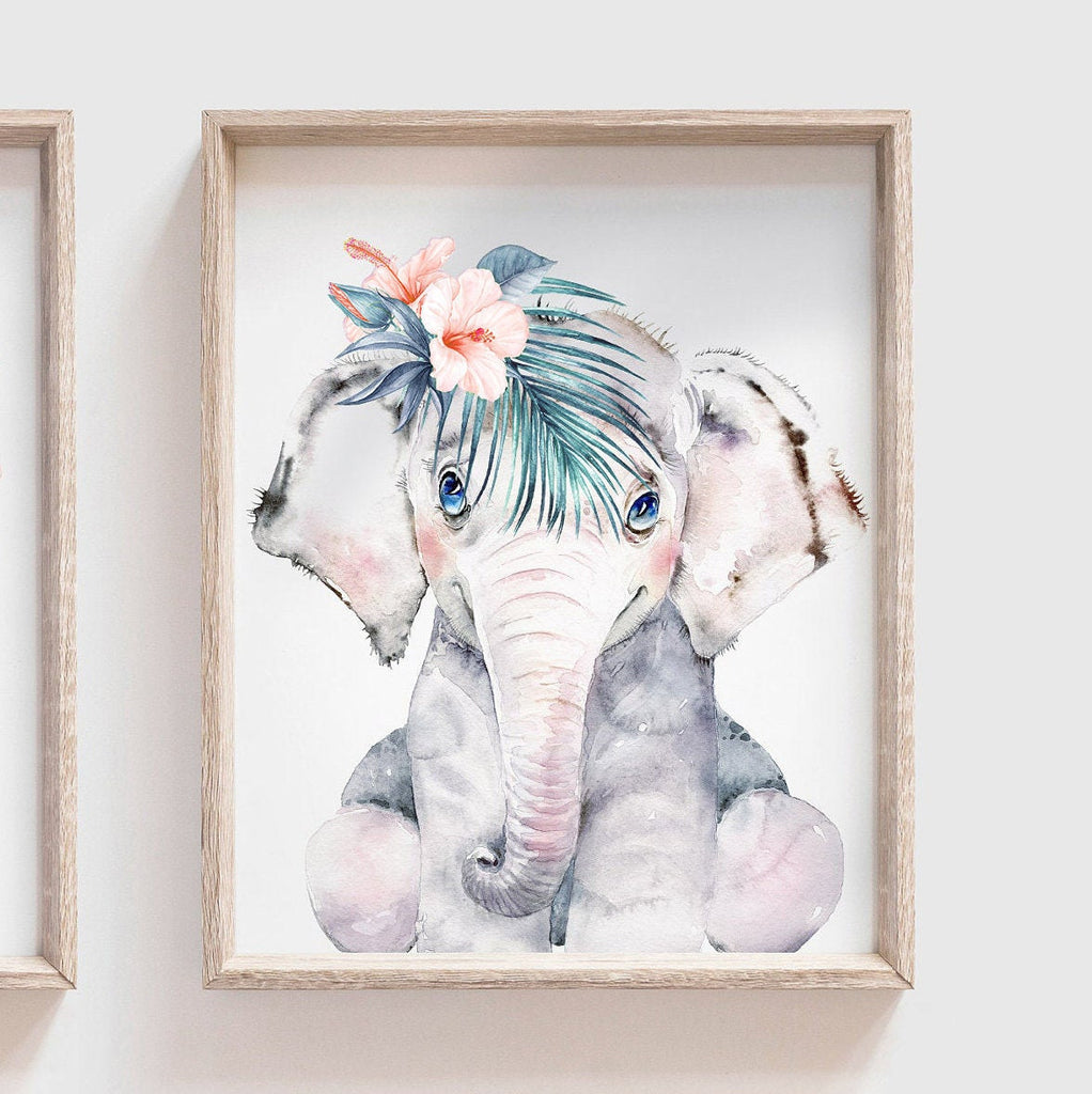 Coral and teal nursery art, tropical theme baby gift, elephant nursery decor for girl, bedroom wall art personalized name, tropical leaf art