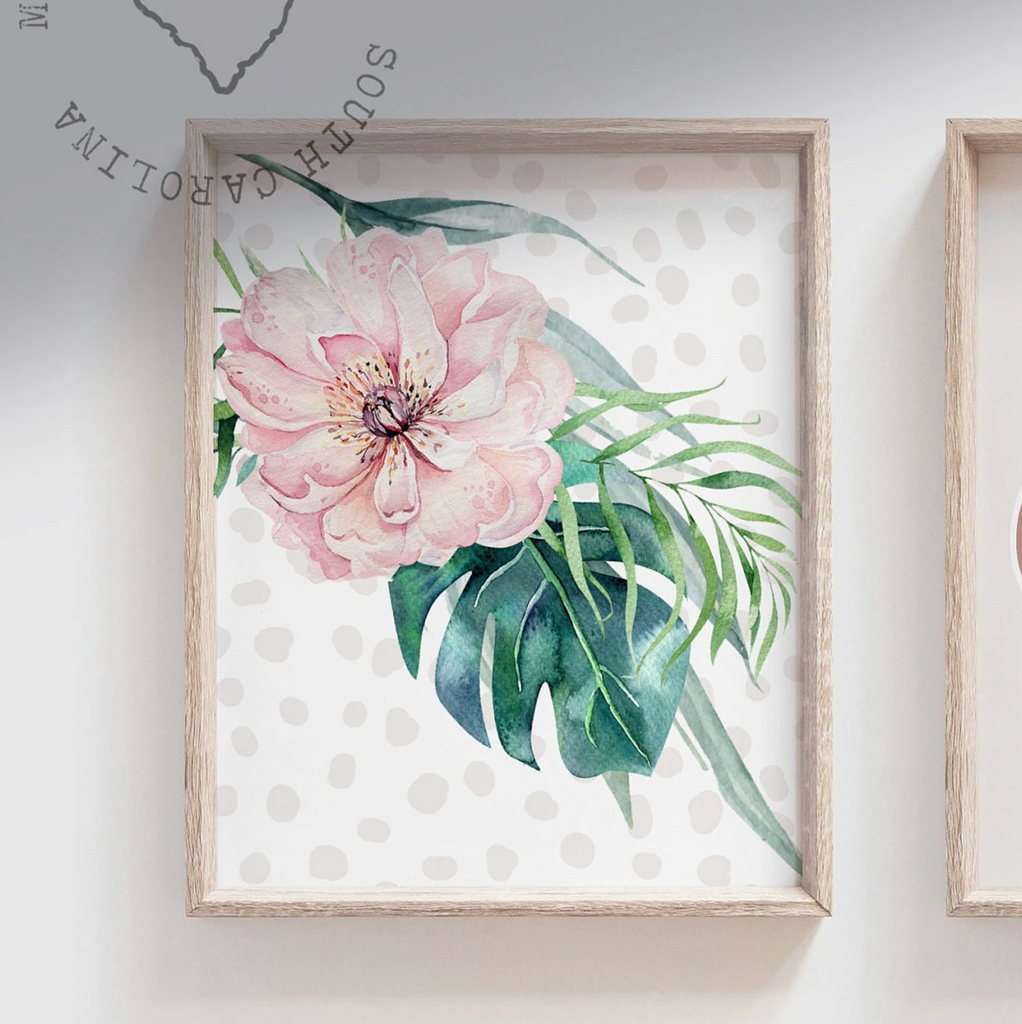 Safari girl room, jungle animals with pink flowers toddler girl art, palm nursery art, personalized name with animals prints, pink green art