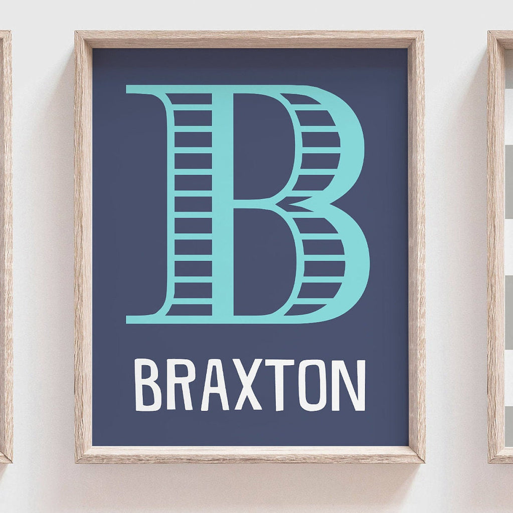 Product description: Shark theme prints in soft navy, scuba blue and smoke gray with thick striped backgrounds. Matching personalized print to be customized with your child's name and initial. Other options are also available in my shop.