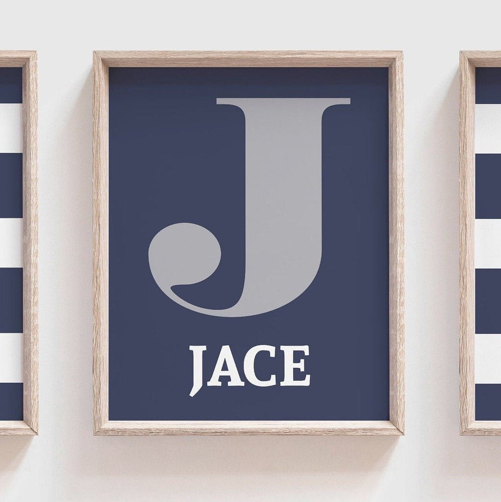 Product description: Shark theme prints in soft navy and smoke gray with thick striped backgrounds. Matching personalized print to be customized with your child's name and initial. Other options are also available in my shop.