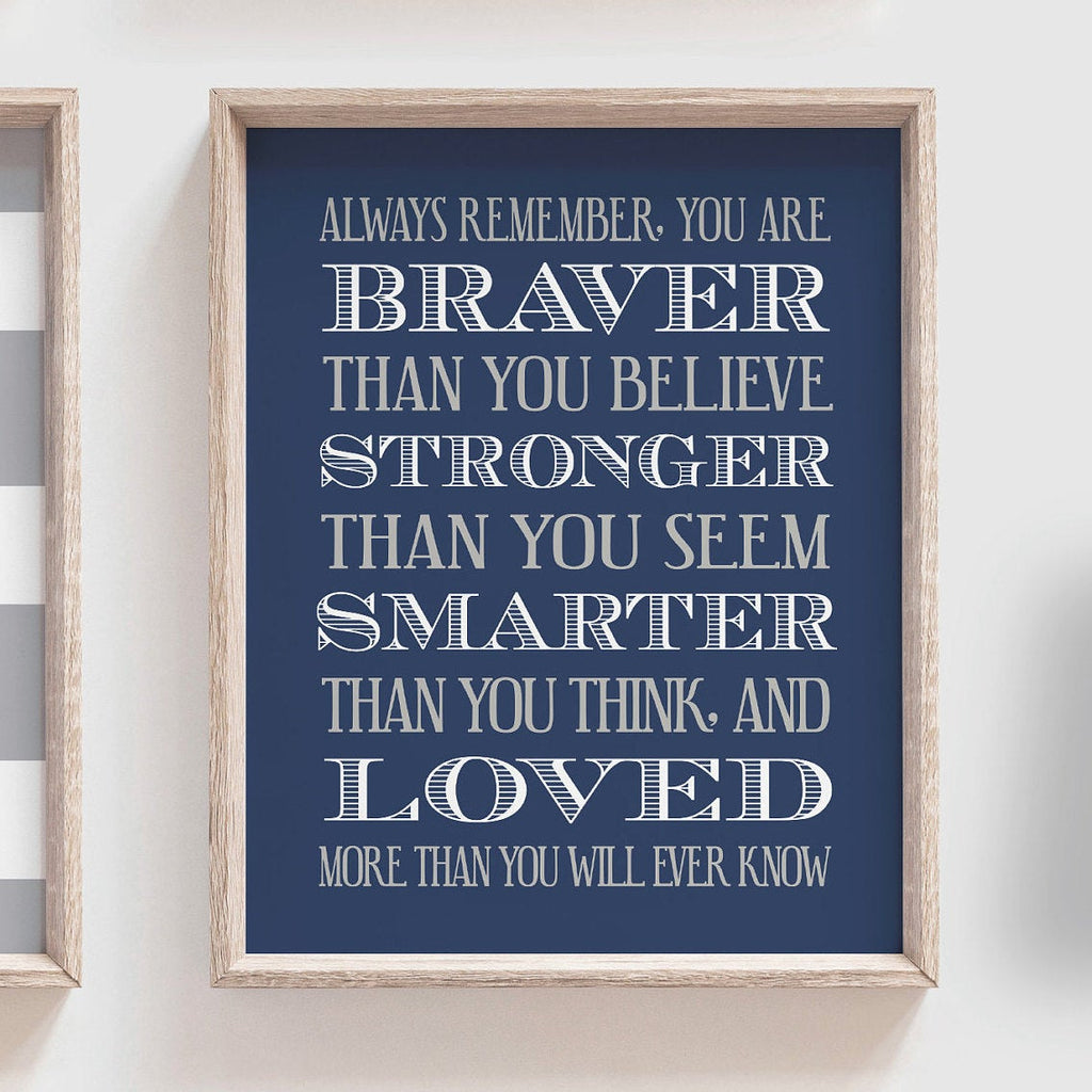 Product description: Sharks in soft navy and smoke gray with thick striped backgrounds. Matching customized name print and quote reading "Remember you are braver than you believe, stronger than you seem, smarter than you think, and loved more than you know." Other color options are available.