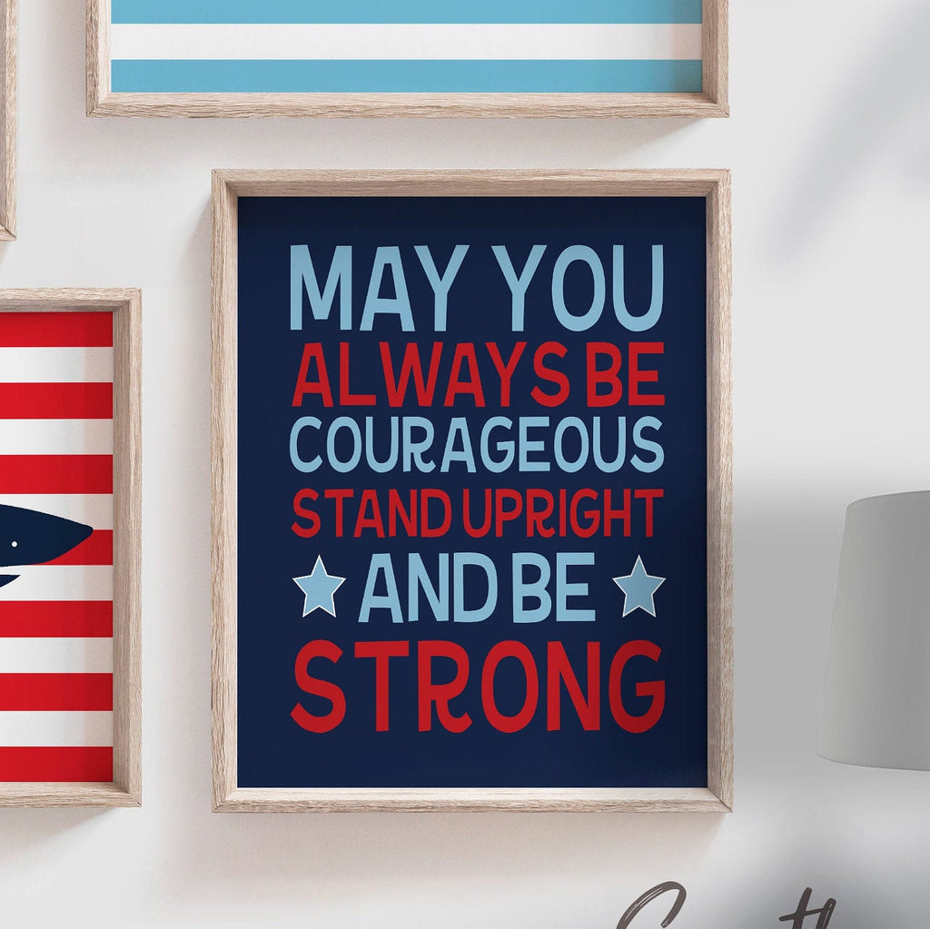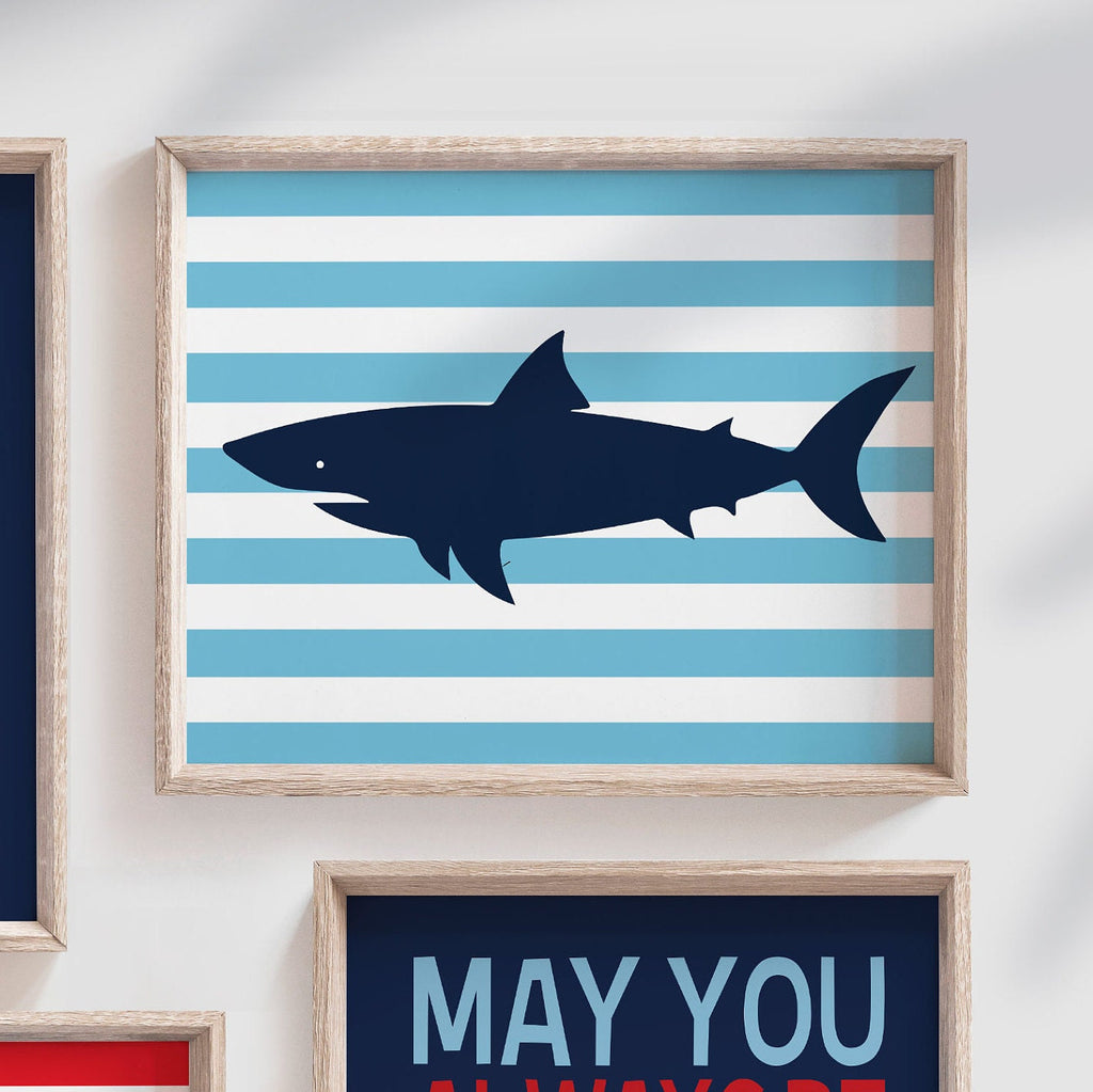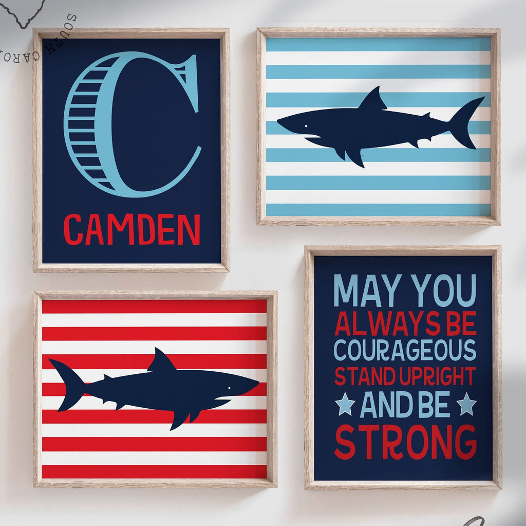 Product description: Navy blue shark prints with red and dusk blue striped backgrounds. Matching name print will be personalized with your child's first name and quote reading, "May you always be courageous, stand upright and be strong." Other color options available.