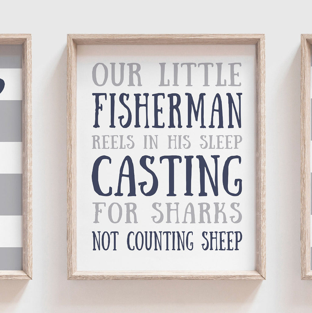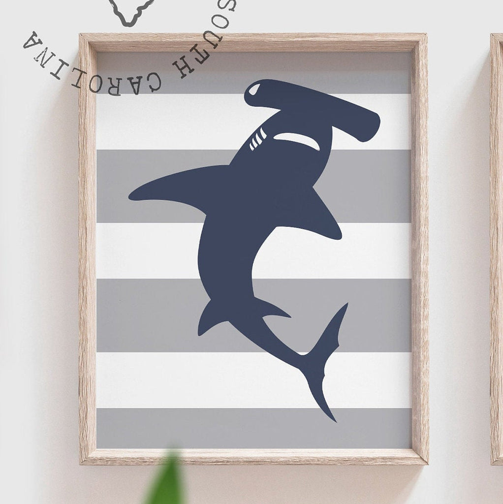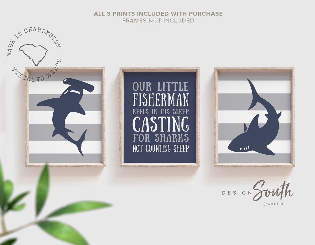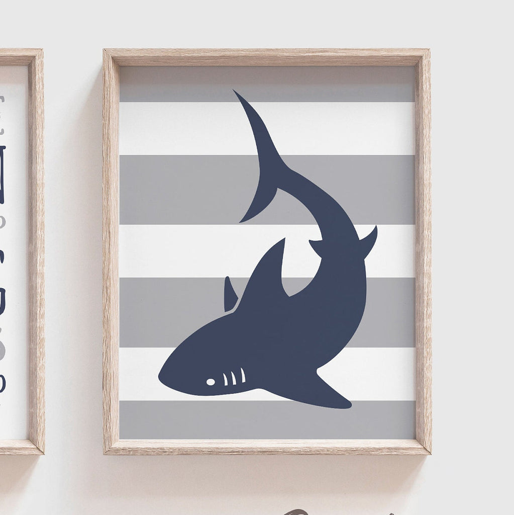 Shark nursery art navy and gray, boy's room fishing theme quote, stripes navy blue gray wall decor, shark kids room art, playroom wall idea