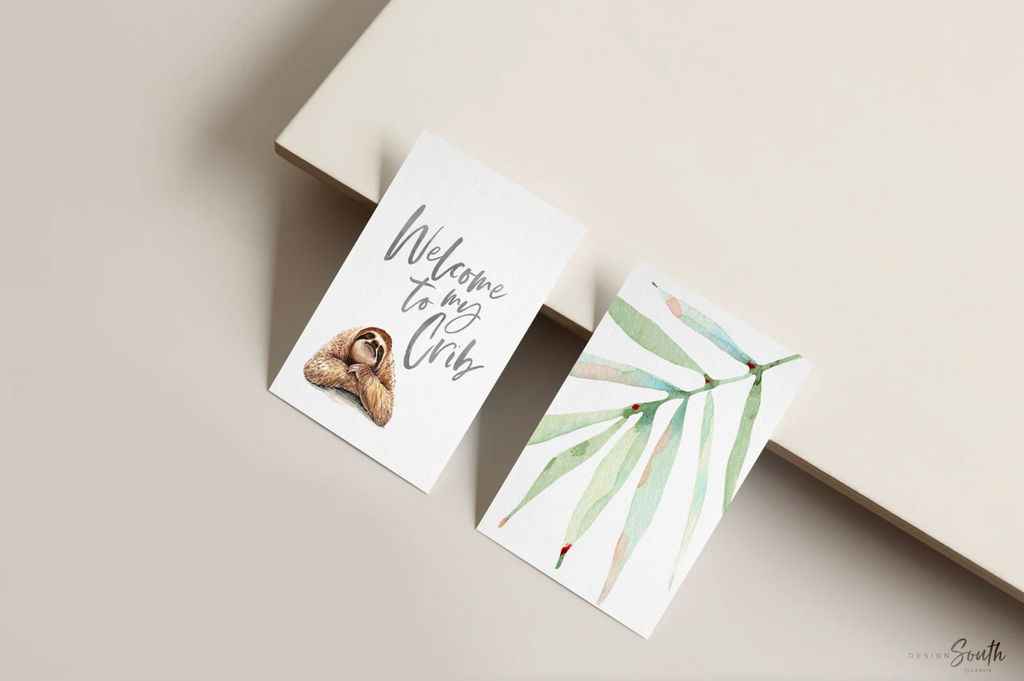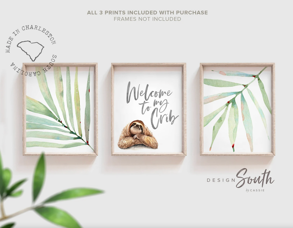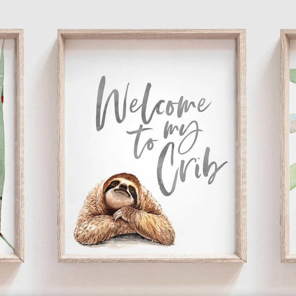 Product description: Sloth themed watercolor prints featuring tropical palm leaves and matching sloth print that reads, "Welcome to my crib" in gray watercolor texture. Other options are also available in my shop.