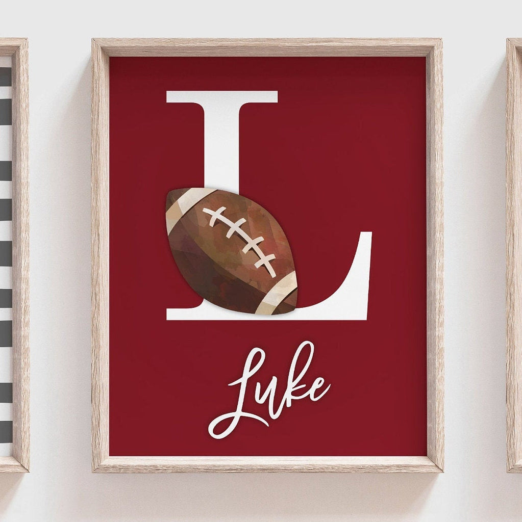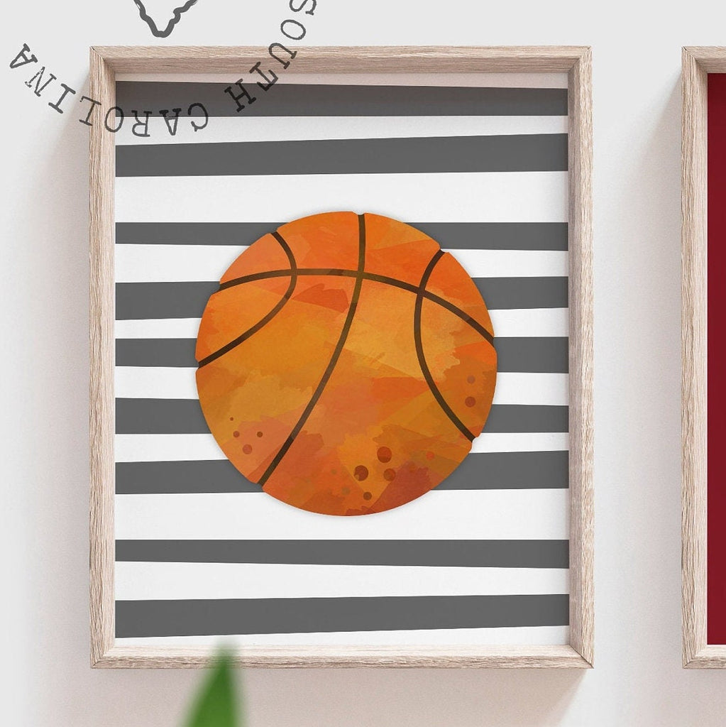 Product description: Sports theme watercolor prints including a basketball and soccer ball with 'spruce' colored stripes and 'lobster' colored monogram print accented with a football to be customized with your child's name and initial. Other options are also available in my shop.