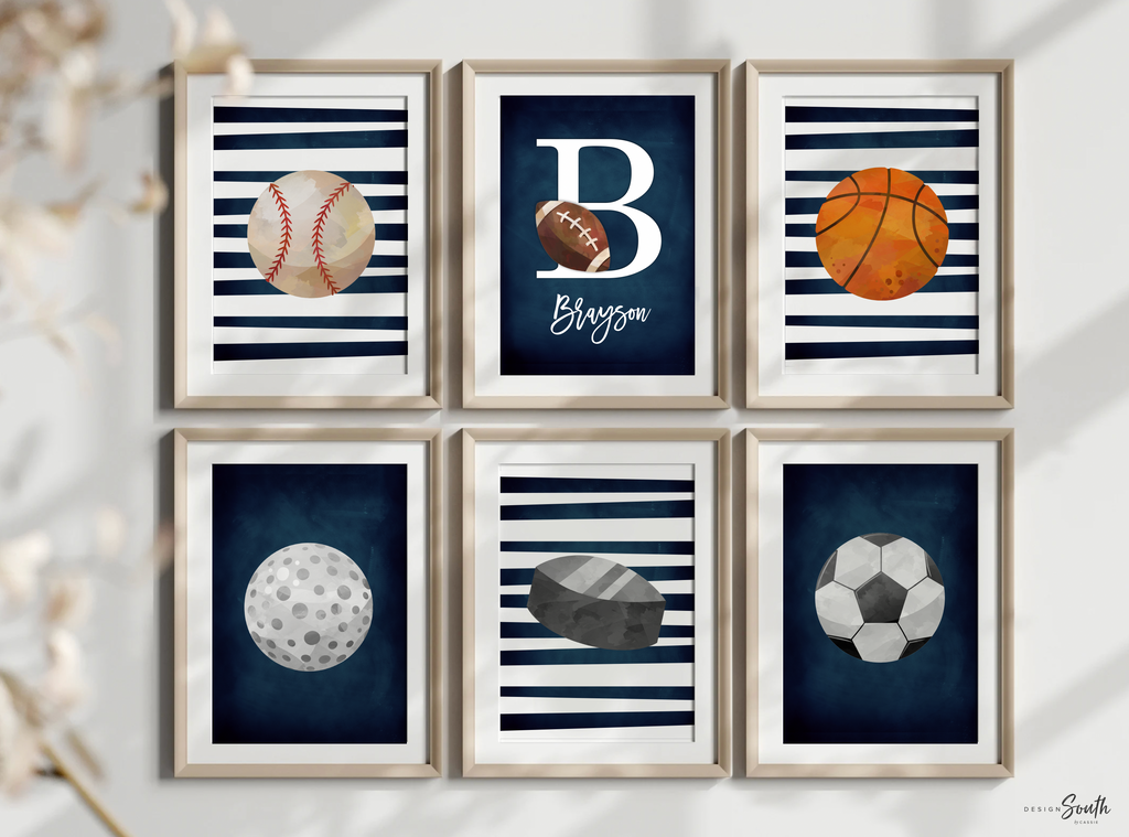 Sports collection print set boys name, sports theme wall pictures, sports art personalized gift, baseball football kids wall art boy nursery