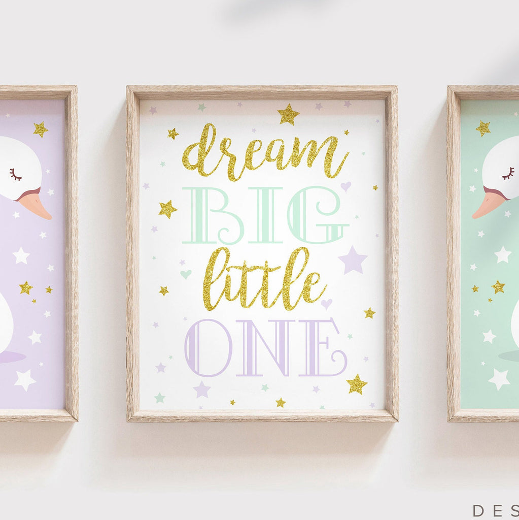 ☛ ☛ ☛ FRAMES ARE NOT INCLUDED ☚ ☚ ☚Thank you for choosing Design South. I take pride in creating custom designs for your home. These wall prints are perfect for a girl's nursery, bedroom or playroom.Product description: Swan designs in lilac and vibrant mint with gold sparkles. Matching quote reading "Dream Big Little One." Other color options available. Note: The item listed is created digitally. Gold glitter nor sparkly paper was used in this design. High resolution photography of sparkles was used to create a 3D appearance of sparkles. What you will receive: Three UNFRAMED art prints. Colors can be customized. A color change is included in the price. Frames are for decoration purposes and are not included. The prints should be framed behind glass once received. These are not canvas prints. See information needed in the ‘notes to seller’ section. My art is professionally printed on high-quality fine art paper. Each piece is printed as ordered.Ready to order? It’s EASY! Complete check out and include the information below in the ‘notes to seller’ section when ordering. 1. Indicate if you would like the prints as shown OR if you would like a color change. If you do not indicate a color change, Design South will assume that you would like the prints in the colors shown above. **NOTE: Please leave a message in the 'notes to seller' section during checkout with your color choice from the chart above if you are requesting colors that are different from this listing. If you do not see the color(s) you want, send me a message! I also accept pictures of nurseries, bedding, and decor for color matching. In the case of a COLOR CHANGE, I will send you a PROOF to your email account. I will use the email account associated with your Etsy account, unless otherwise noted. Please VERIFY the proof, so that I can print and ship your order. Waiting to verify your proof will delay shipping. 2. Choose the size of your prints. Options: 5x7, 8x10, 11x14.Timeline: Orders are carefully packaged and typically ready to ship within 3-5 business days. See my shop Ibsite for updated turnaround times. If you would like a custom order, visit my shop website and send me a message. Note: Custom orders will require a proof sent to you via email and confirmation regarding the proof for your order to be mailed. **Each day that we do not receive information such as your child's name, or an approval of the proof, it will delay the shipping date.Terms of Use: Product cannot be reproduced, resold or distributed.