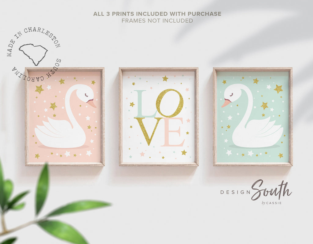 Product description: Swan designs in lilac and mint with gold sparkles with matching LOVE print. Note: The item listed is created digitally. Gold glitter nor sparkly paper was used in this design. High resolution photography of sparkles was used to create a 3D appearance of sparkles. Other color options are also available in my shop.