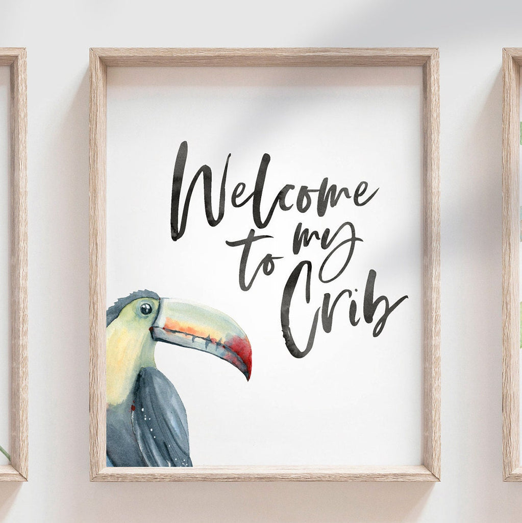 Welcome to my crib sign tropical toucan, modern art print set nursery, modern newborn decor gender neutral, newborn above crib art idea palm