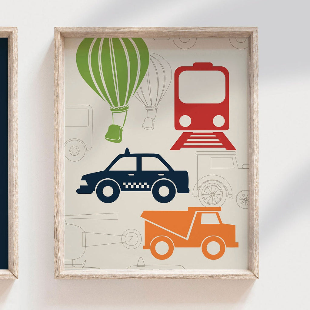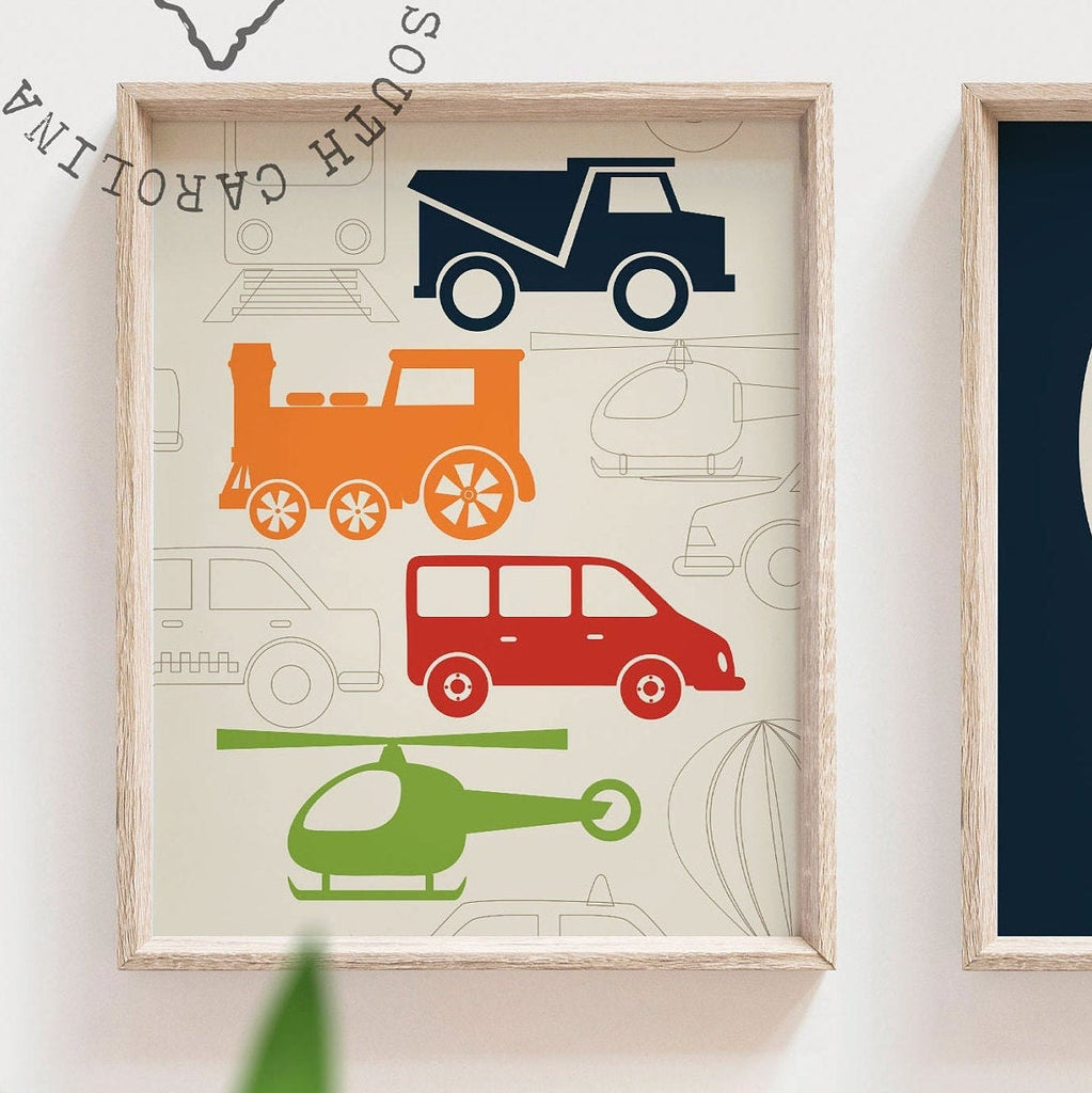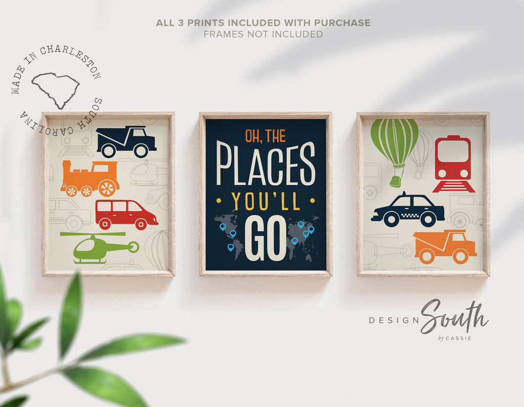 Transportation nursery decor, blue, red, green, oh the places you'll go, transportation prints, helicopter, transportation nursery, train