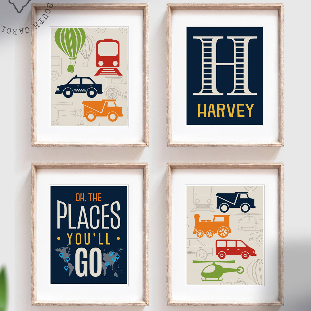 Transportation nursery decor, blue, red, orange, oh the places you'll go, personalized print, name, transportation prints, helicopter, train